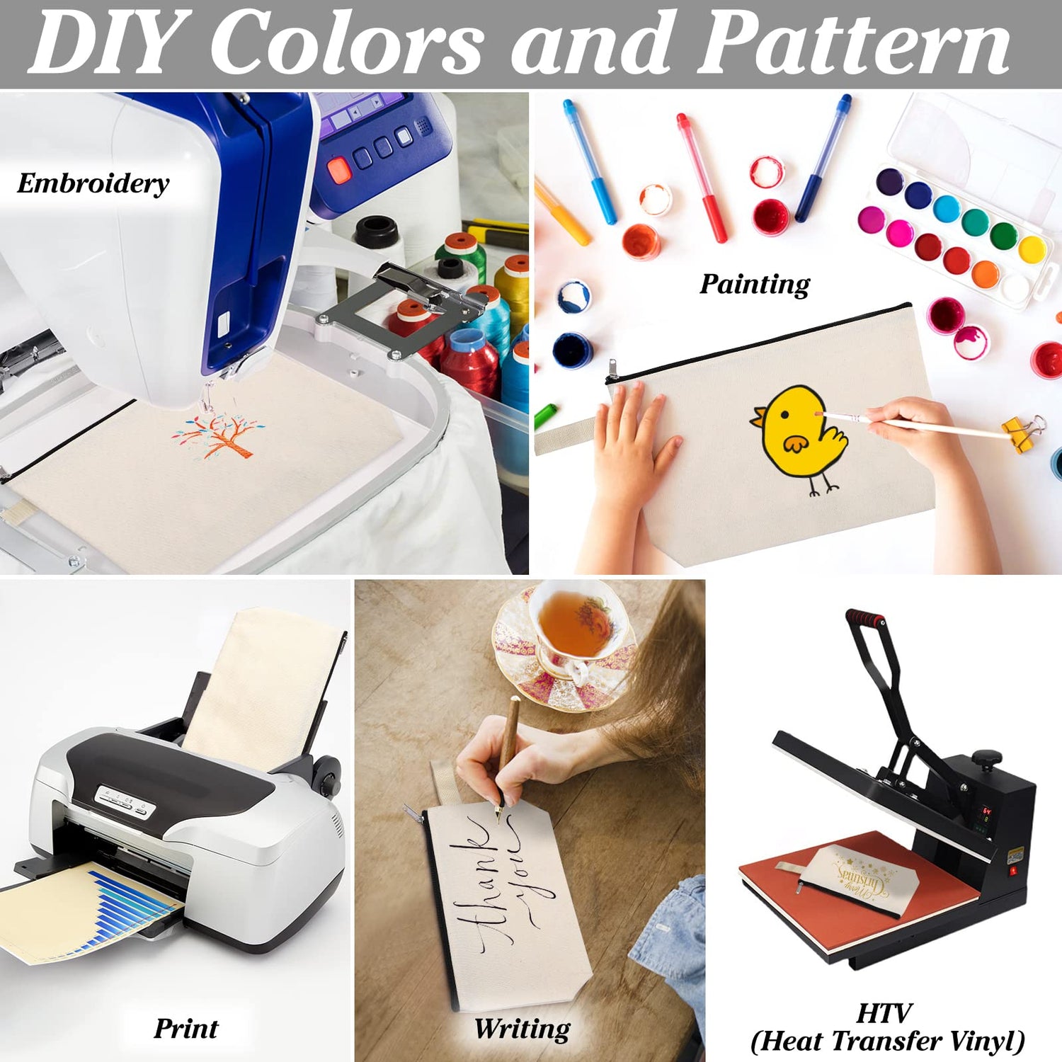 These cotton canvas pouches Made of 12oz thick cotton canvas with wide bottom for large capacity. Smooth metal zipper, durable, lightweight, soft and tearproof, washable and long-lasting. It's great to storage or organizer office supplies, bills, stationery, makeup, jewelry, USB cables, travel necessities, passport, gift and other small items. It can be used as cosmetic bag, pencil case, tool bag,cellphone case, coin purse, bill bag, gift bag, or travel organizer. The both sides are blank, which allows to DIY Color and Pattern. Specifications: Material: 12oz durable cotton canvas with smooth metal zipper Size: Small Dimension: 9”L x 4.7”W x 1.8”D (23 x 12 x 4.5cm) Medium Dimension: 10.2”L x 5.5”Wx 2.1”D (26 x 14 x 5.5cm) Large Dimension: 12.2”L x 7.5”Wx 2.7”D (31 x 19 x 7cm) Weight: Small: 0.64lb, Medium: 0.8lb, Large: 1.3lb Package Includes: 10 x zipper canvas pouches