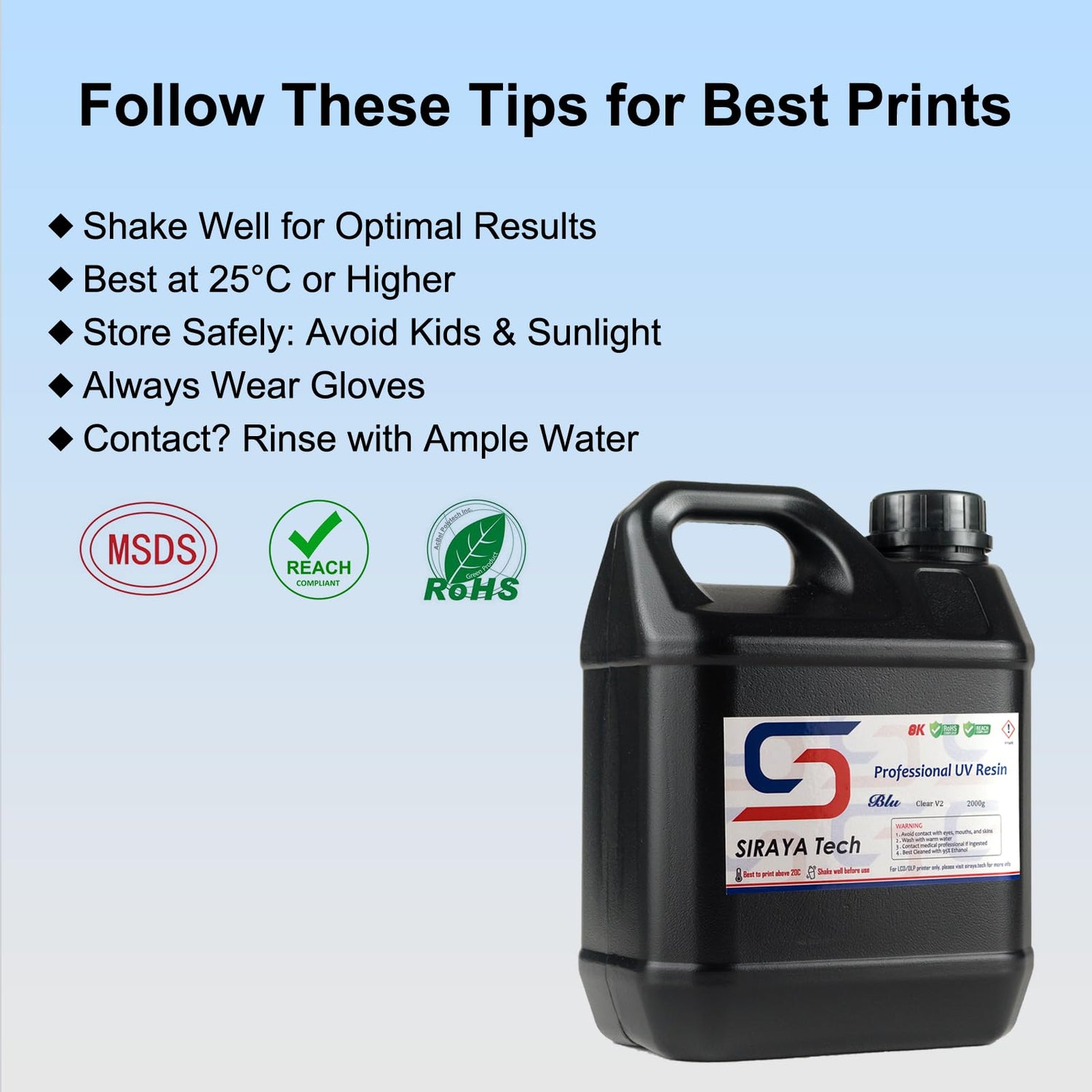 - High Precision and Resolution - Achieve crisp details and smooth surface finishes with Blu Clear V2. This resin features excellent fluidity, fast curing, and supports high-resolution prints, even on 8K LCD/DLP printers. Optimal printing temperature: 25°C+.
