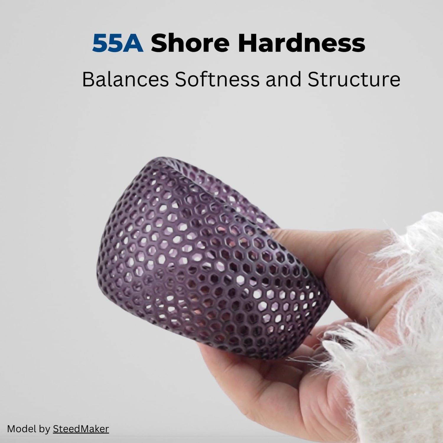 - 55A Shore Hardness – Balanced Flexibility & Strength – This elastic resin offers a good mix of flexibility and structural integrity, softer than our Tenacious Flex while maintaining excellent compression properties for prototyping shock-absorbing components.