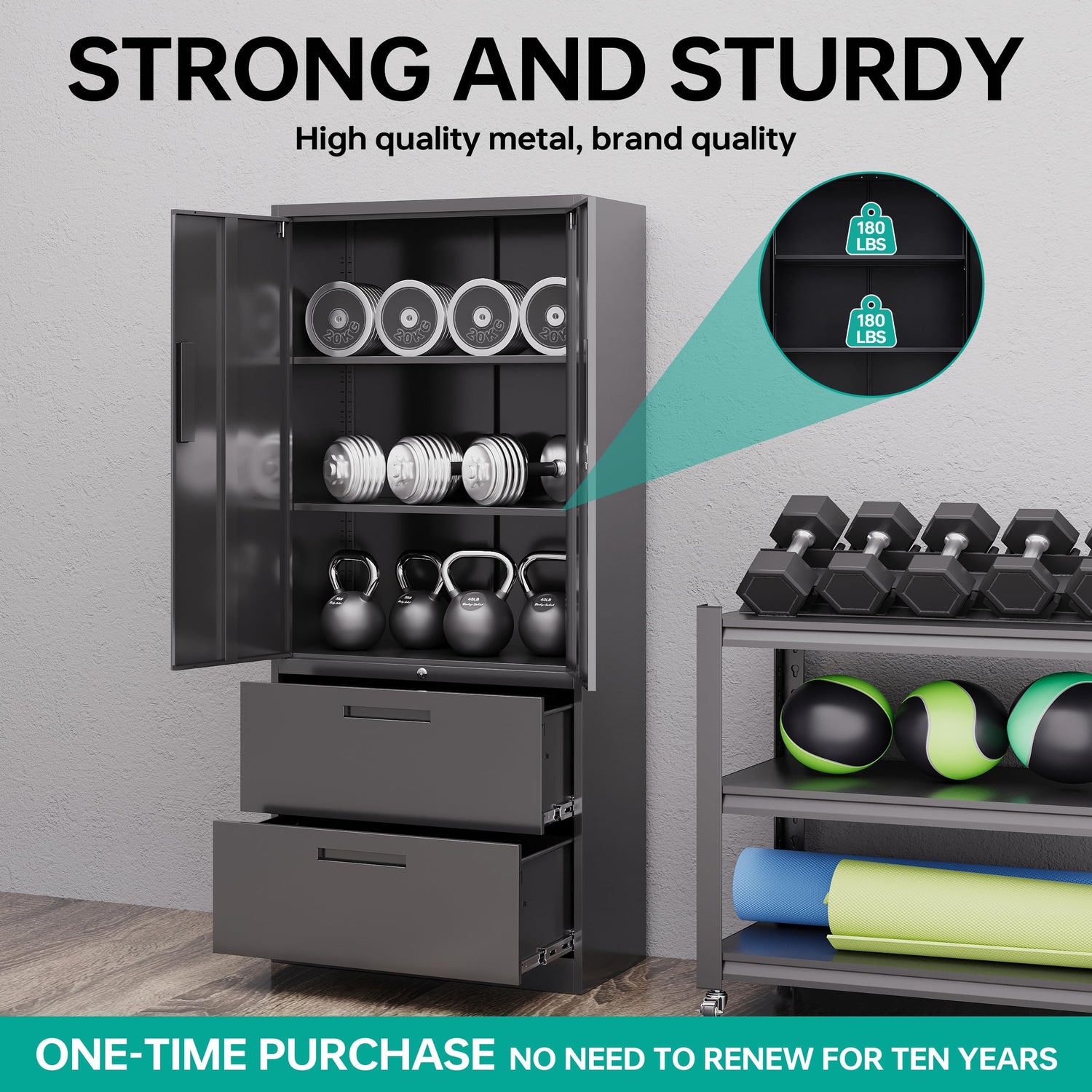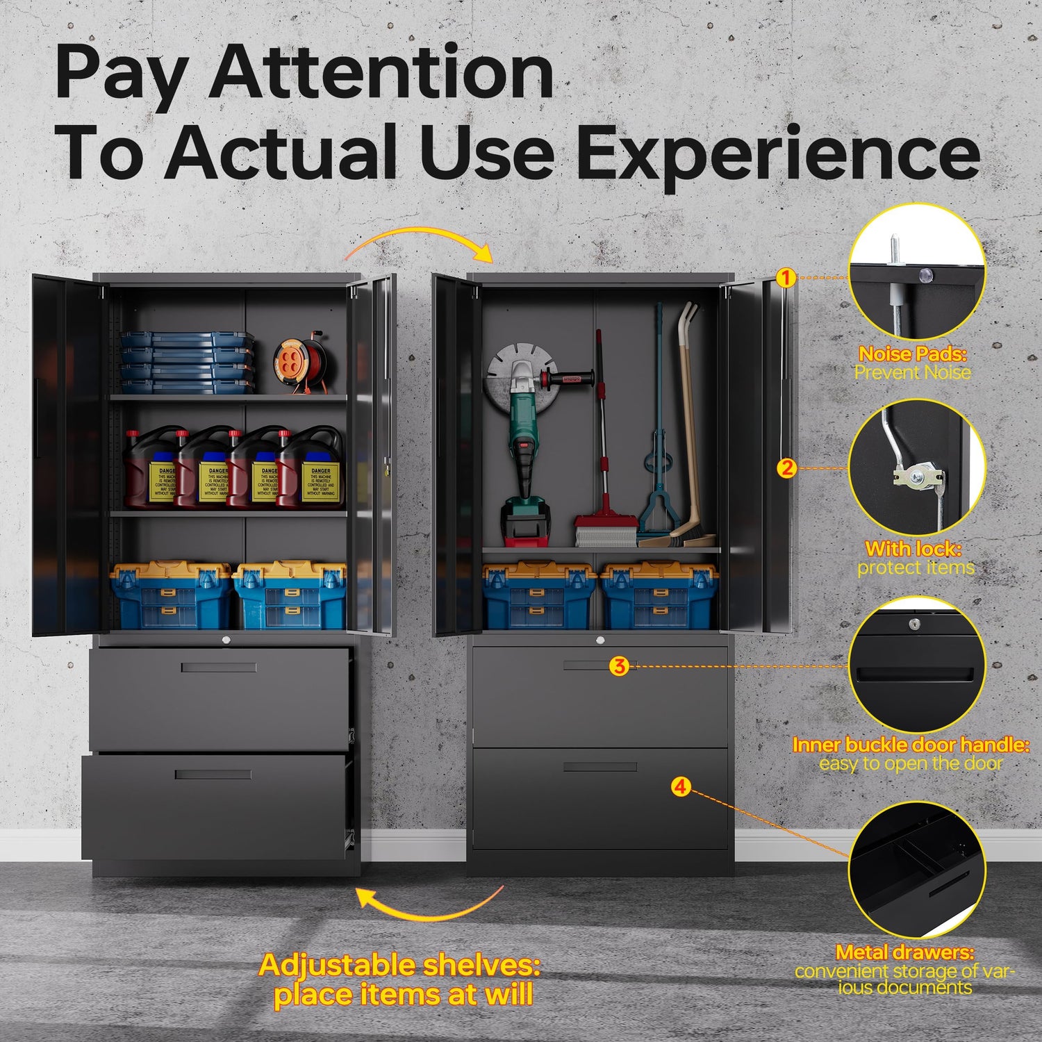 - 【Large Capacity】: High steel storage cabinet with 2 adjustable shelf to meet your different needs for placing items, shelf and door lock can highly protect items from temperature, dirt and dust