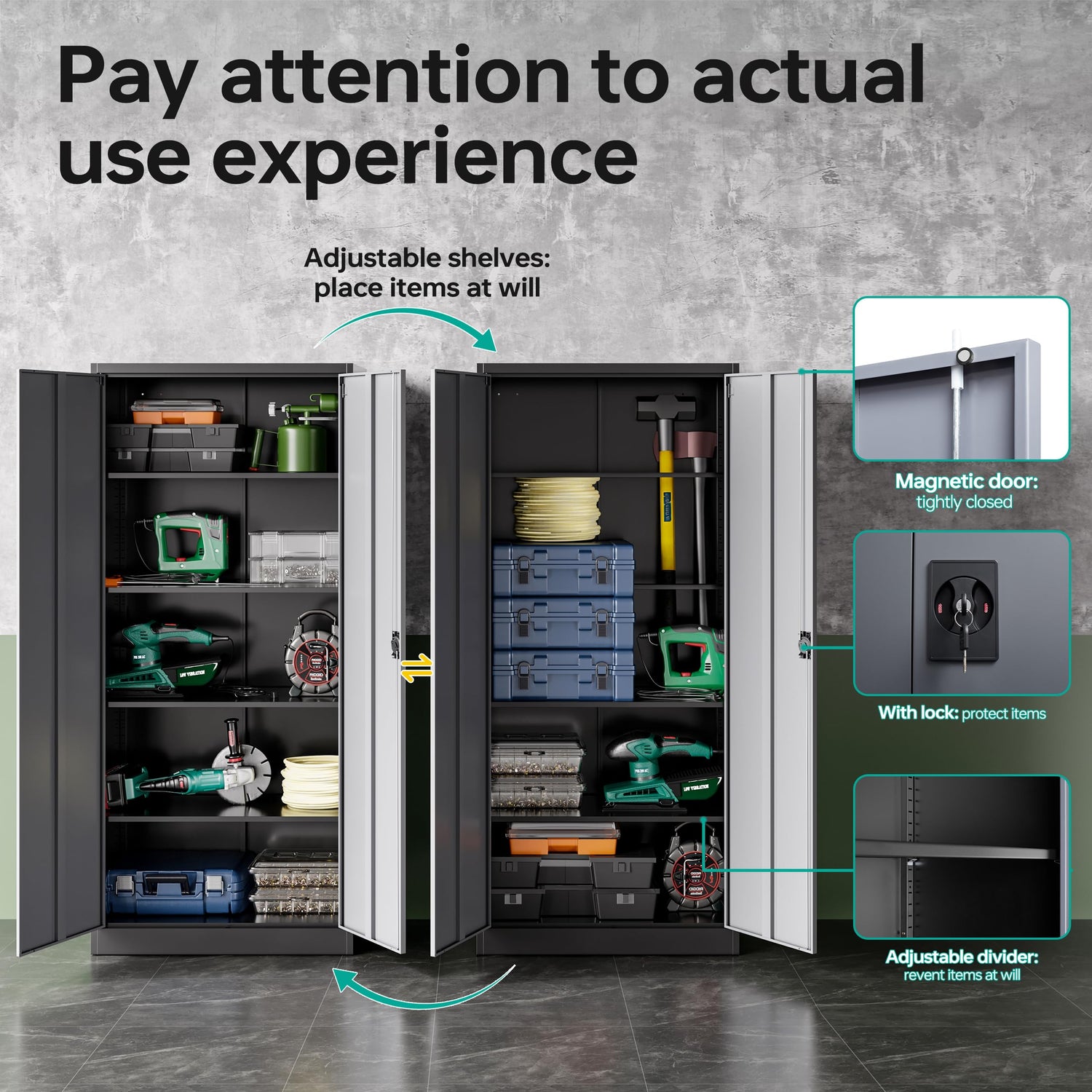- ✔️☆【Adjustable Shelf Design】: The garage cabinets storage uses 4 adjustable shelves. You can move to the desired height by adjusting the shelf pegs according to the size of the things. so that you can divide the office storage cabinet space distribution. You can also design garage storage flexibly and remove the shelves for more standing room
