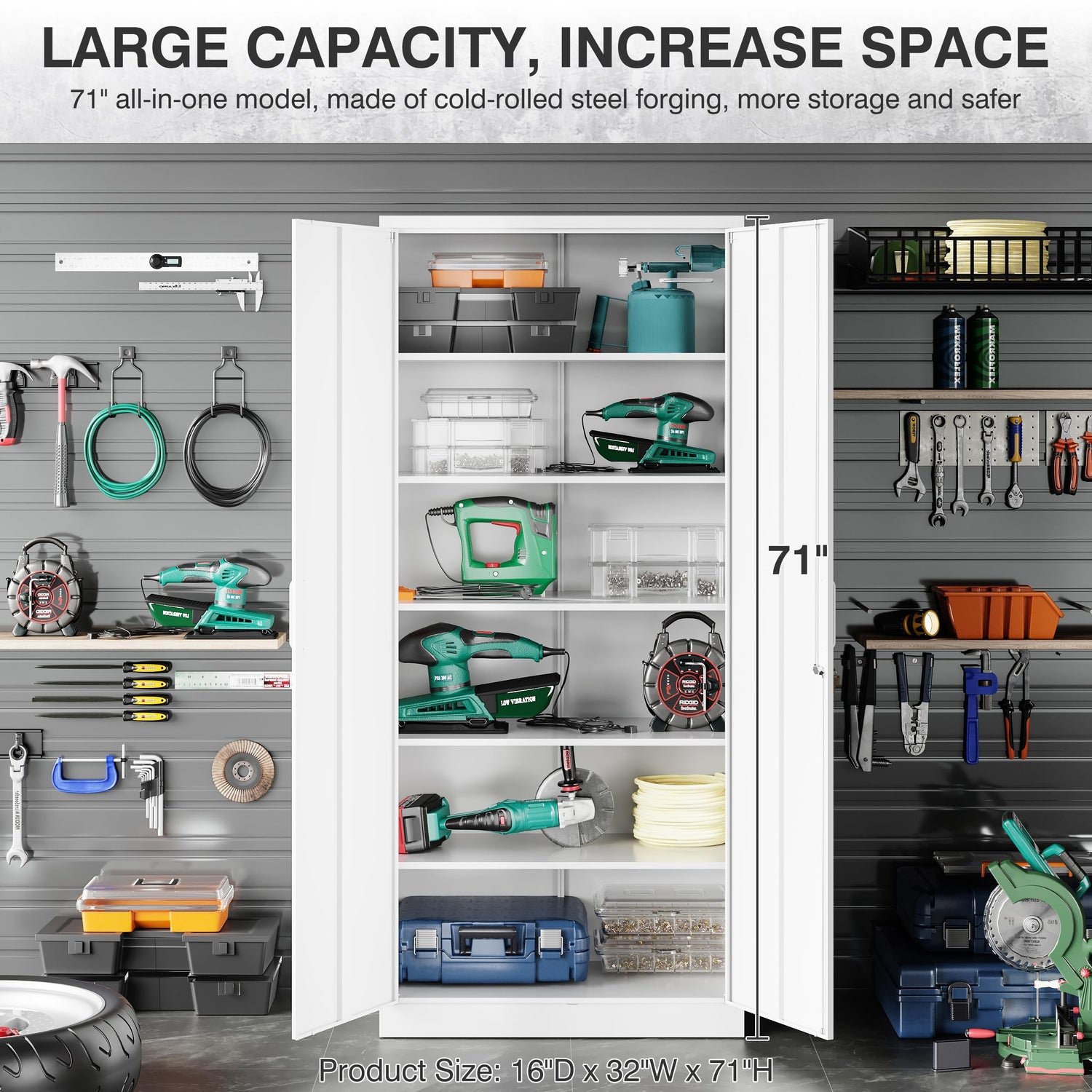 SISESOL Metal Garage Storage Cabinet with Doors and Shelves, 71" Multifunctional Garage Storage Closet Large Garage Locker with Adjustable Shelves & Locking Doors Steel Storage Tall Cabinet (White)