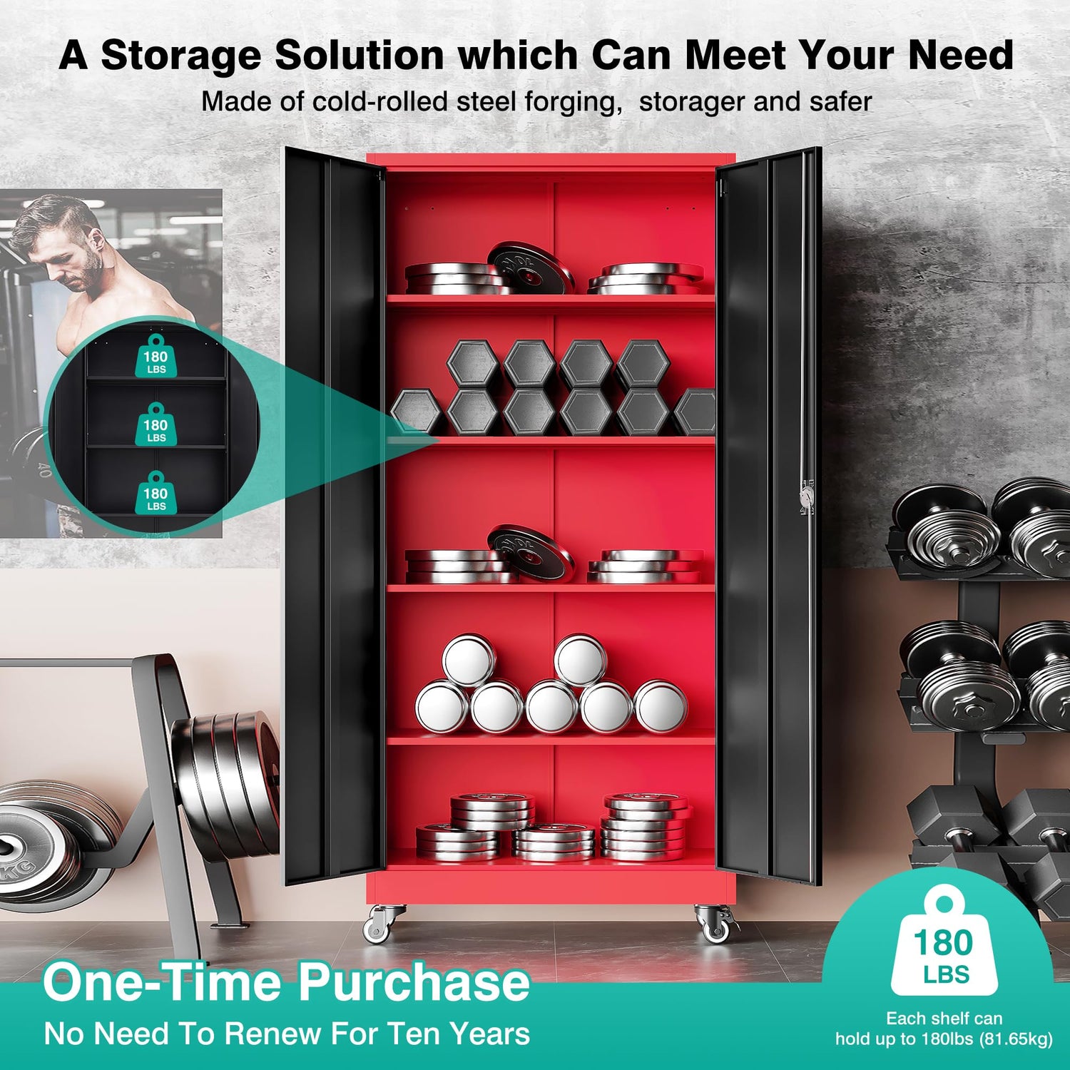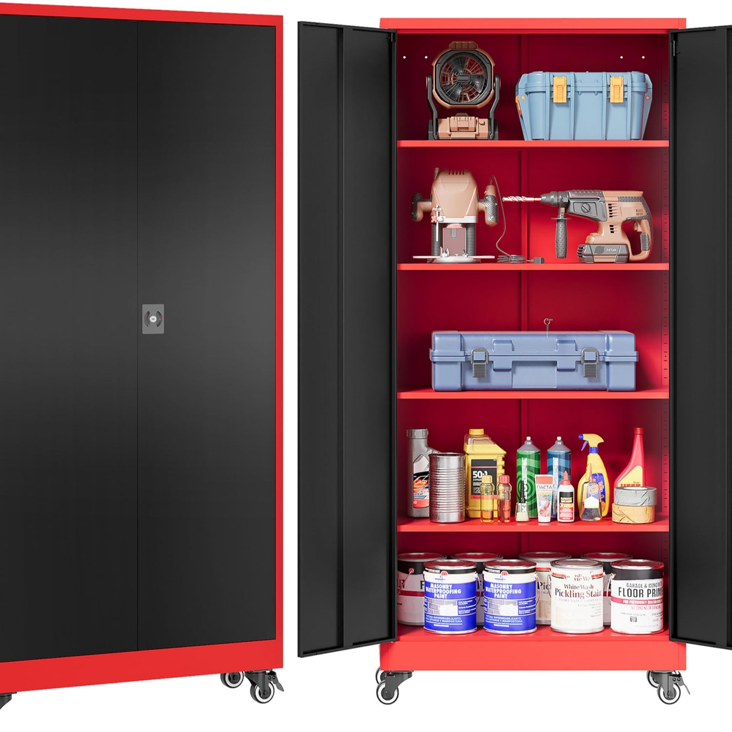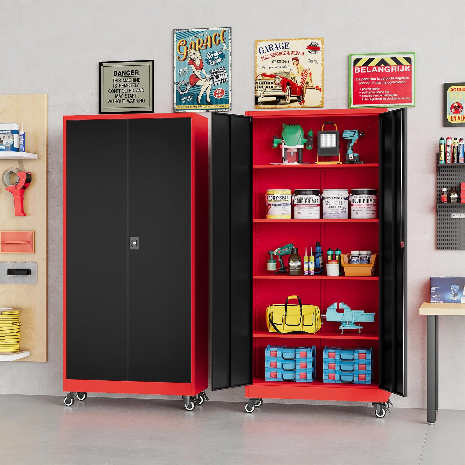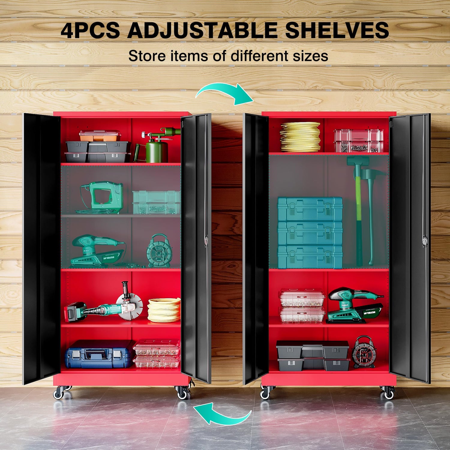 SISESOL Metal Storage Cabinet with Wheels,Rolling Garage Storage Cabinet with Lock,Red Metal Cabinet on Wheels,Tall Tool Storage Cabinet on Wheels for Garage,Home,Office,Shop