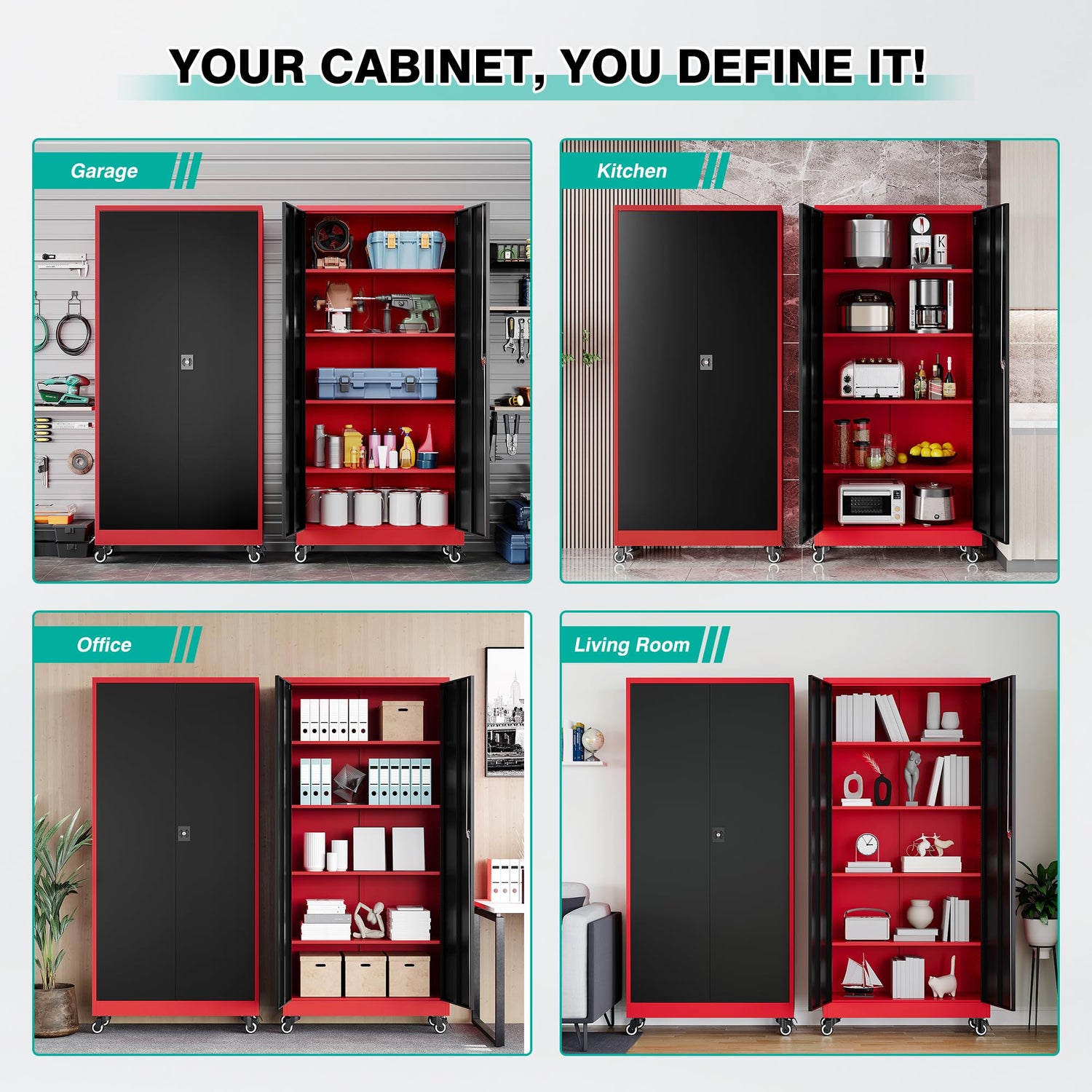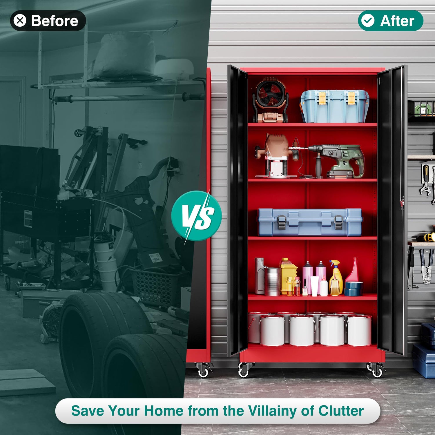 - 5 Tiers for Large Capacity: The garage cabinets storage uses 5 adjustable shelves. You can move to the desired height by adjusting the shelf according to the size of the things. so that you can divide the tool cabinet space distribution. You can also design garage storage flexibly and remove the shelves for more standing room.