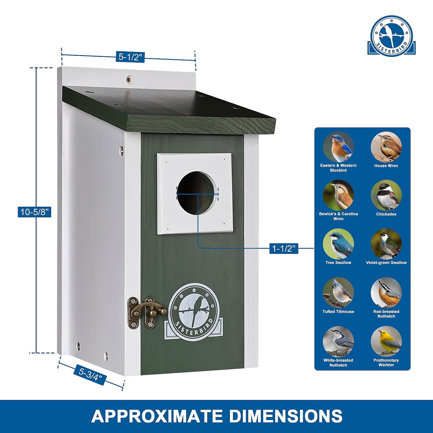- 1-1/2" ENTRANCE HOLE SIZE: SISTERBIRD bird houses for outside have a properly-sized entrance hole, through this bluebird houses for outside you can attract desirable species to your bird house, such as Bluebird, Wren, Tree Swallow, Chickadees, etc. While this birdhouse excluding predators and unwanted occupants, for example, European starlings