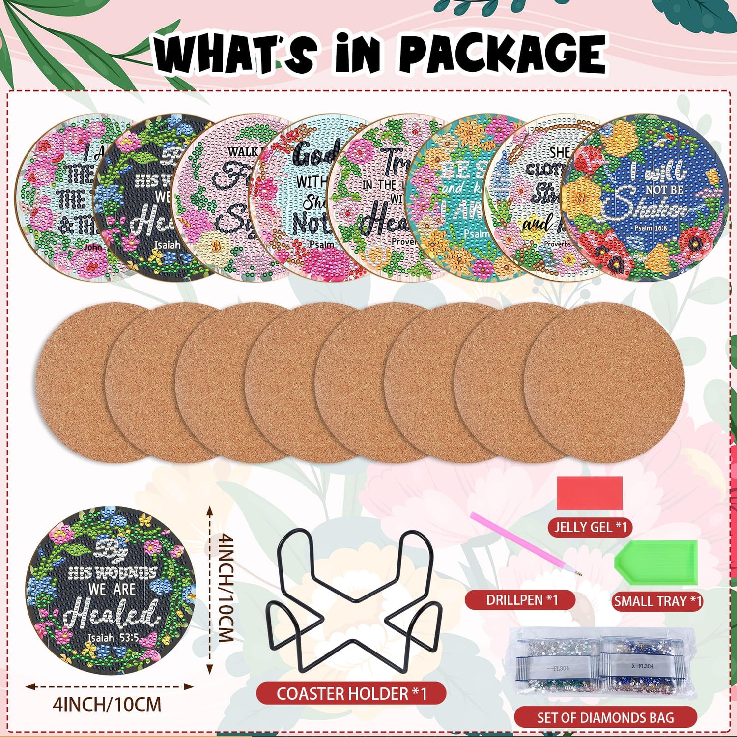 - What's in Package: It's a paper box contained 8 christian bible verse diamond painting coasters, a set of diamond painting supplies include jelly gel, drill pen, a small tray and diamond bags, and a stainless steel coaster holder.