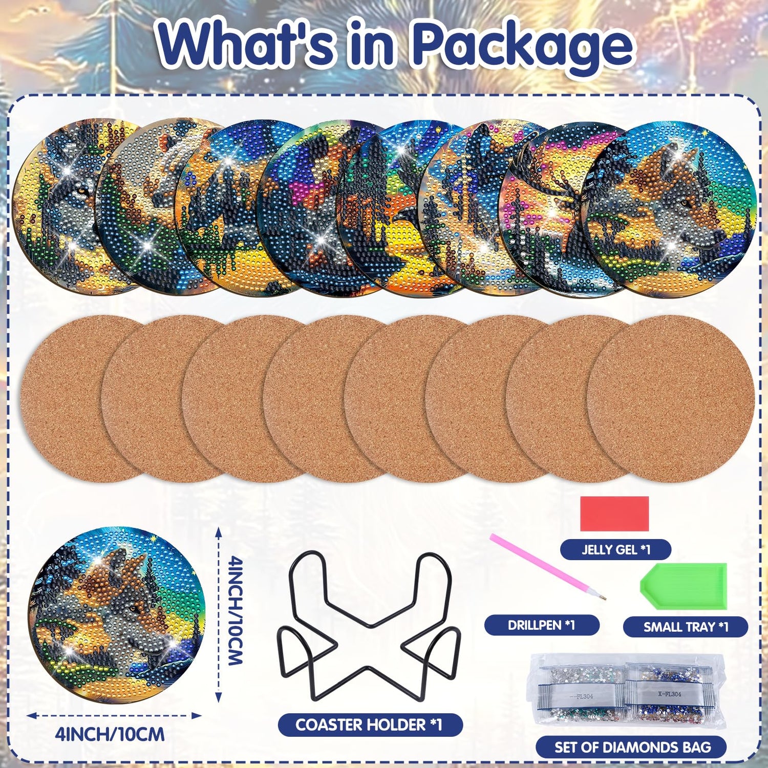 - Enchanting Nature & Wildlife Designs: Eight circular diamond art coasters feature stunning forest landscapes, wolves, deer, and night skies rendered in vibrant, suitable for adding a bold, artistic touch to any table or desk