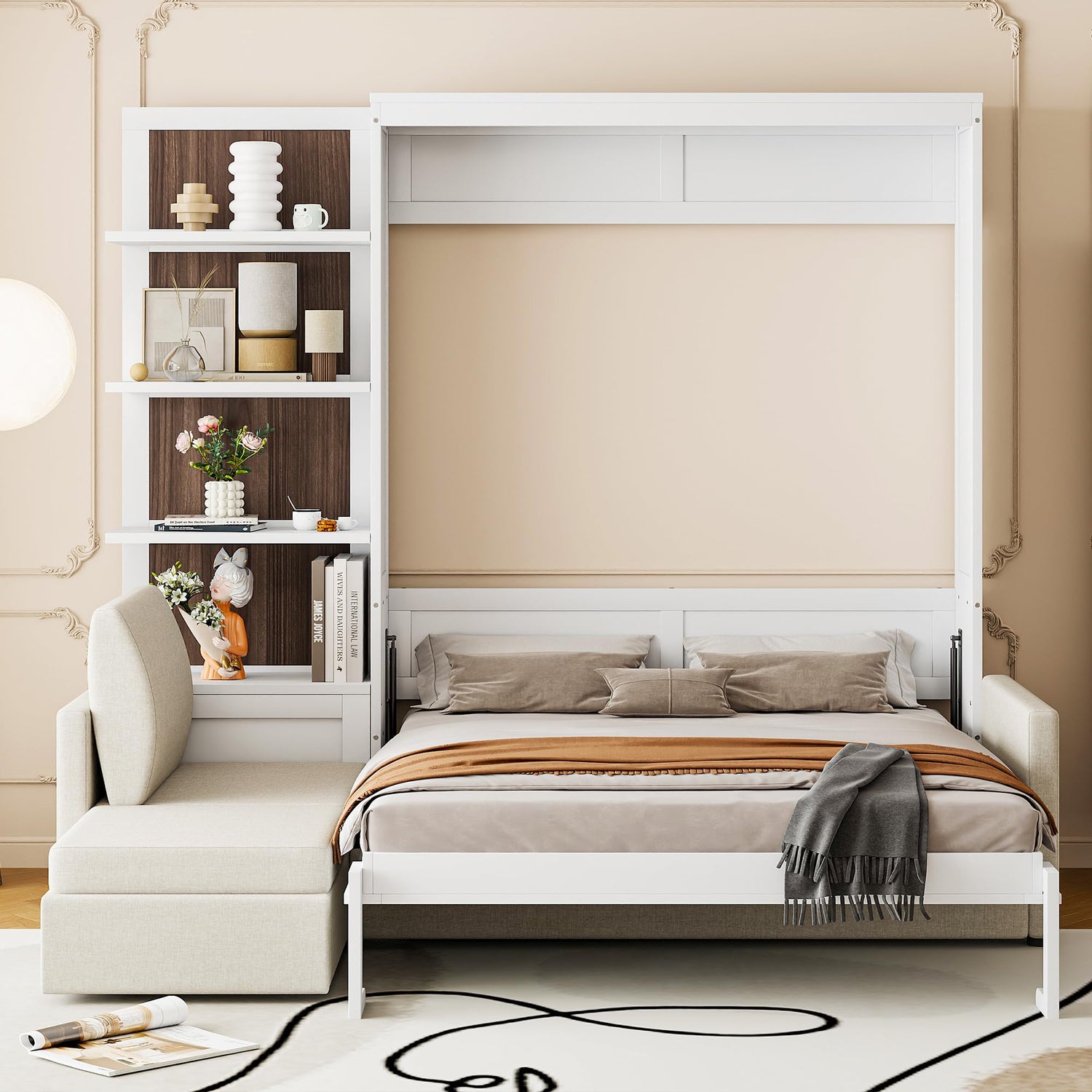 SIYSNKSI Queen Size Murphy Bed with Upholstered L-Shape Sofa and Shelves, Solid Wood Murphy Wall Bed Cabinet Bed, Folding Platform Bed for Guest Room Study Office Bedroom (White-33cf)