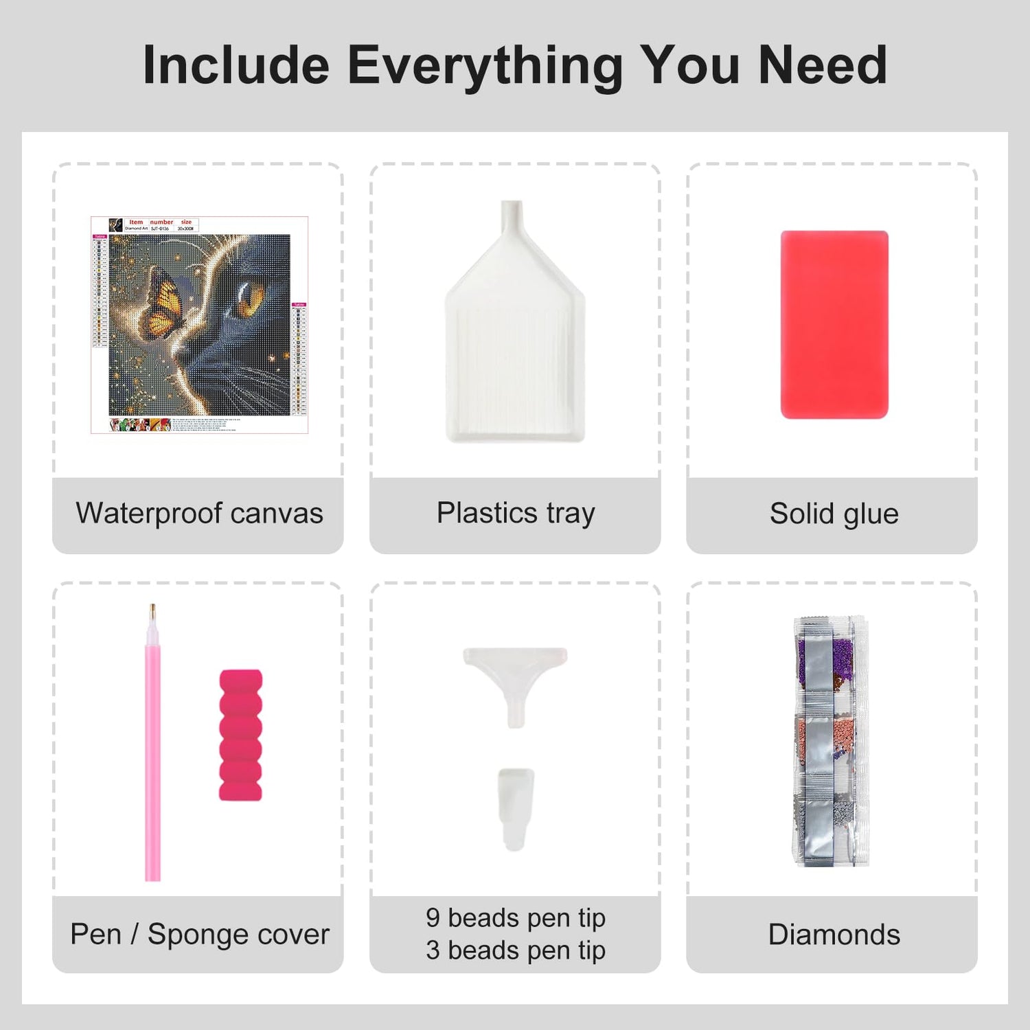- Contain All Tools: Our diamond painting kits contain all tools, 1*HD canvas, 1*set drill bags, 1*drill pen, 1*jelly glue, 1*tray, 1*9 beads pen tips, 1*3 beads pen tips, so you don’t need to purchase any additional tools. And all diamonds are provided 30% more than needed to complete