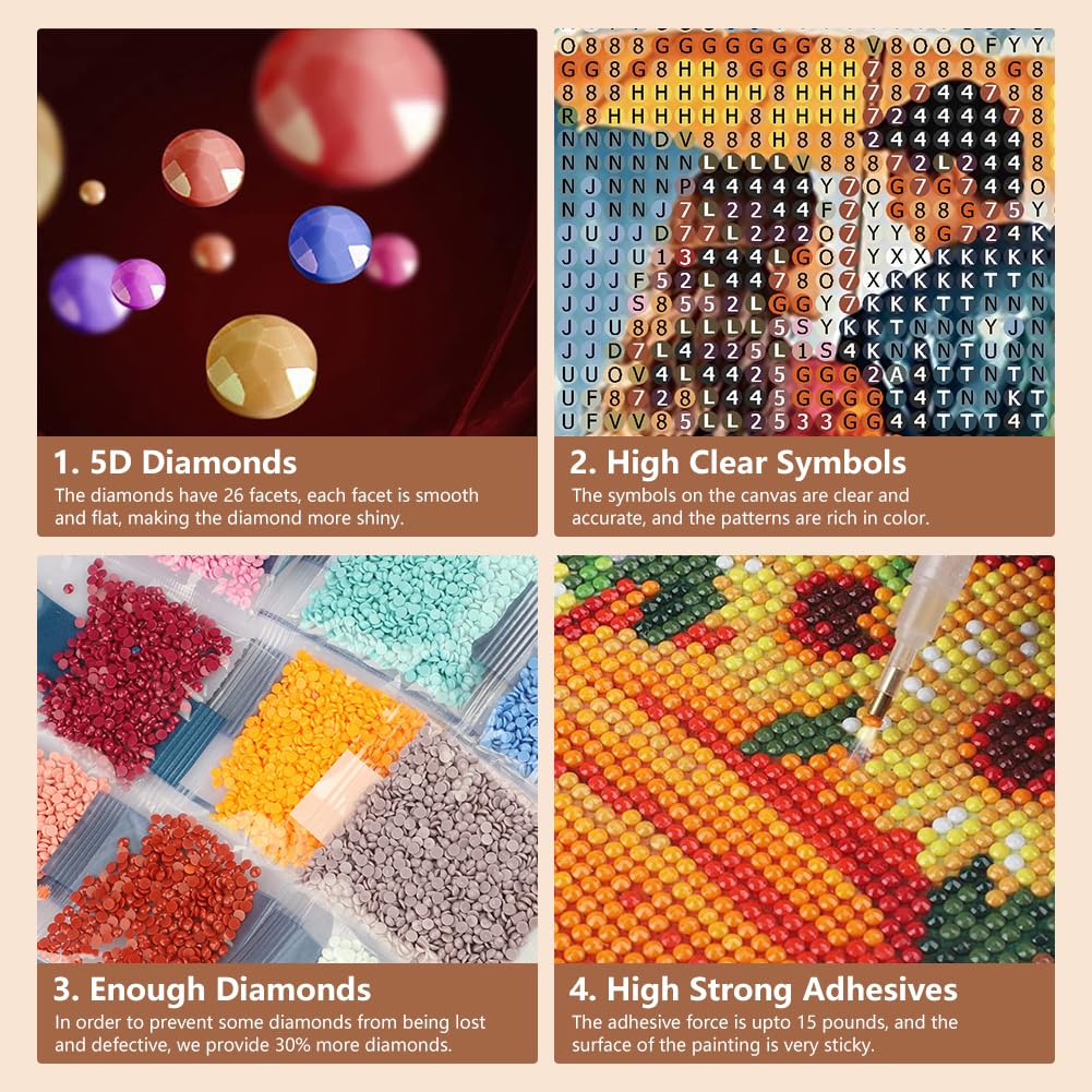 - Contain All Tools: Our diamond painting kits contain all tools, 1*HD canvas, 1*set drill bags, 1*drill pen, 1*jelly glue, 1*tray, 1*9 beads pen tips, 1*3 beads pen tips, so you don’t need to purchase any additional tools. And all diamonds are provided 30% more than needed