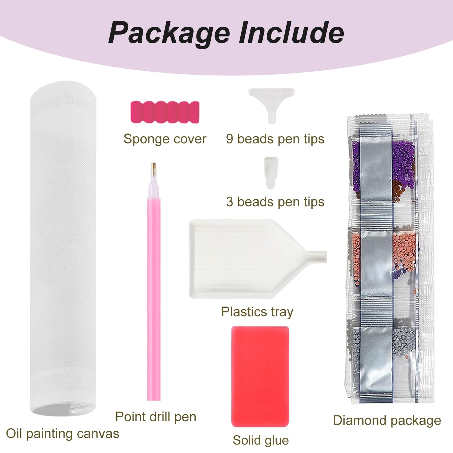 - Contain All Tools: Diamond painting kits contain all tools, 1*HD canvas, 1*set drill bags, 1*drill pen, 1*jelly glue, 1*tray, 1*9 beads pen tips, 1*3 beads pen tips, so you don’t need to purchase any additional tools. And all diamonds are provided 30% more than needed to complete