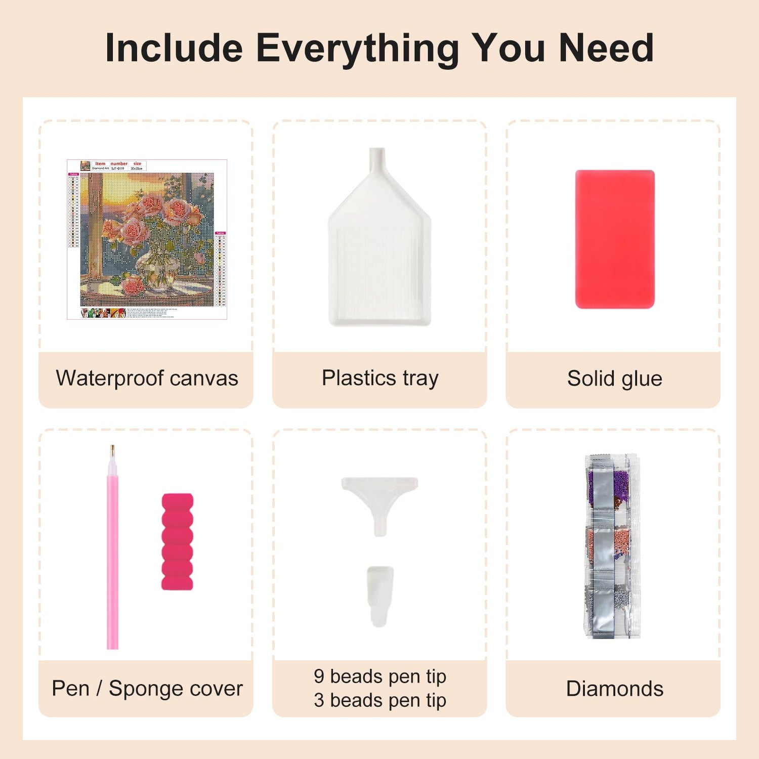- Contain All Tools: Our diamond painting kits contain all tools, 1*HD canvas, 1*set drill bags, 1*drill pen, 1*jelly glue, 1*tray, 1*9 beads pen tips, 1*3 beads pen tips, so you don’t need to purchase any additional tools. And all diamonds are provided 30% more than needed to complete