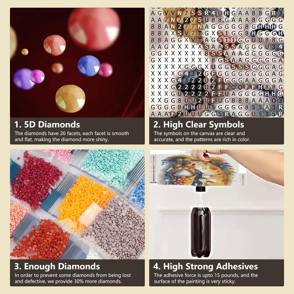 - Contain All Tools: Our diamond painting kits contain all tools, 1*HD canvas, 1*set drill bags, 1*drill pen, 1*jelly glue, 1*tray, 1*9 beads pen tips, 1*3 beads pen tips, so you don’t need to purchase any additional tools. And all diamonds are provided 30% more than needed
