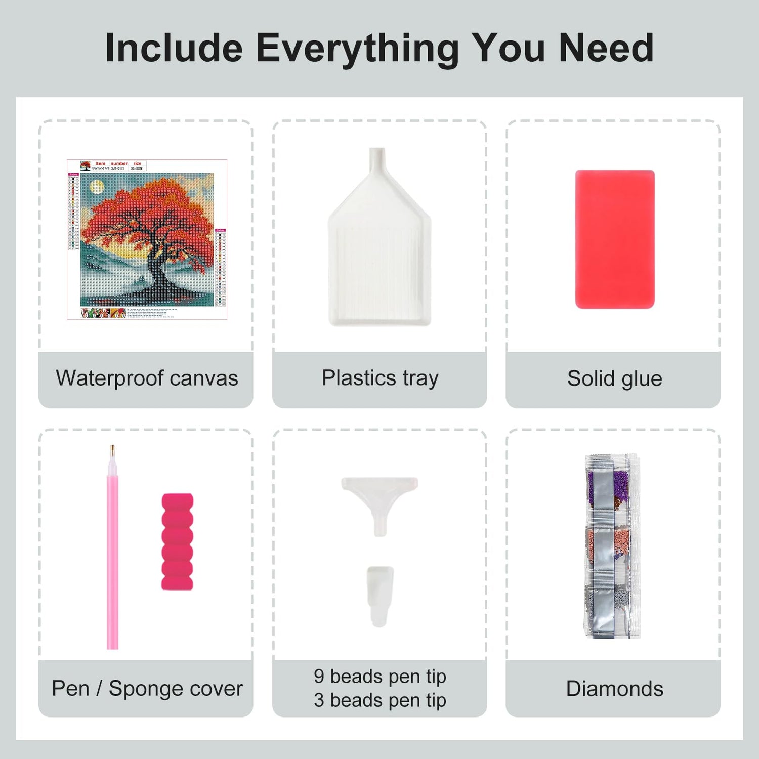 - Contain All Tools: Our diamond painting kits contain all tools, 1*HD canvas, 1*set drill bags, 1*drill pen, 1*jelly glue, 1*tray, 1*9 beads pen tips, 1*3 beads pen tips, so you don’t need to purchase any additional tools. And all diamonds are provided 30% more than needed to complete