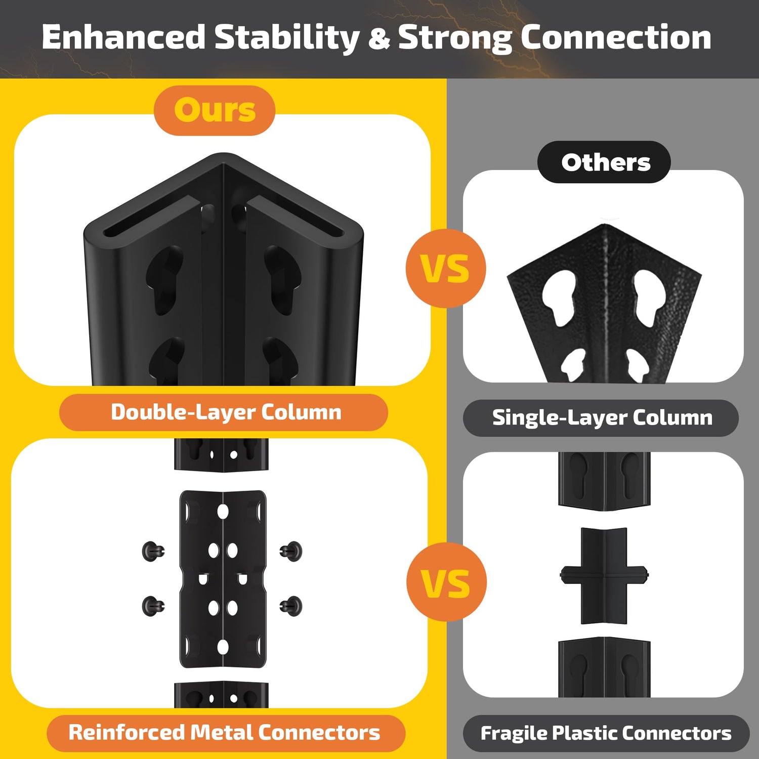 - 【Super Robust Metal Connectors & 10-Minutes Assembly】Unlike plastic connectors, our heavy duty shelving incorporates stronger metal connectors, effectively creating a solid bond between the upper and lower posts and maintaining structural integrity when fully loaded. Equipped with a hammer and gloves, the interlocking boltless design of the utility shelf enables you to set it up in just 10 minutes. You can store your items with confidence and peace of mind