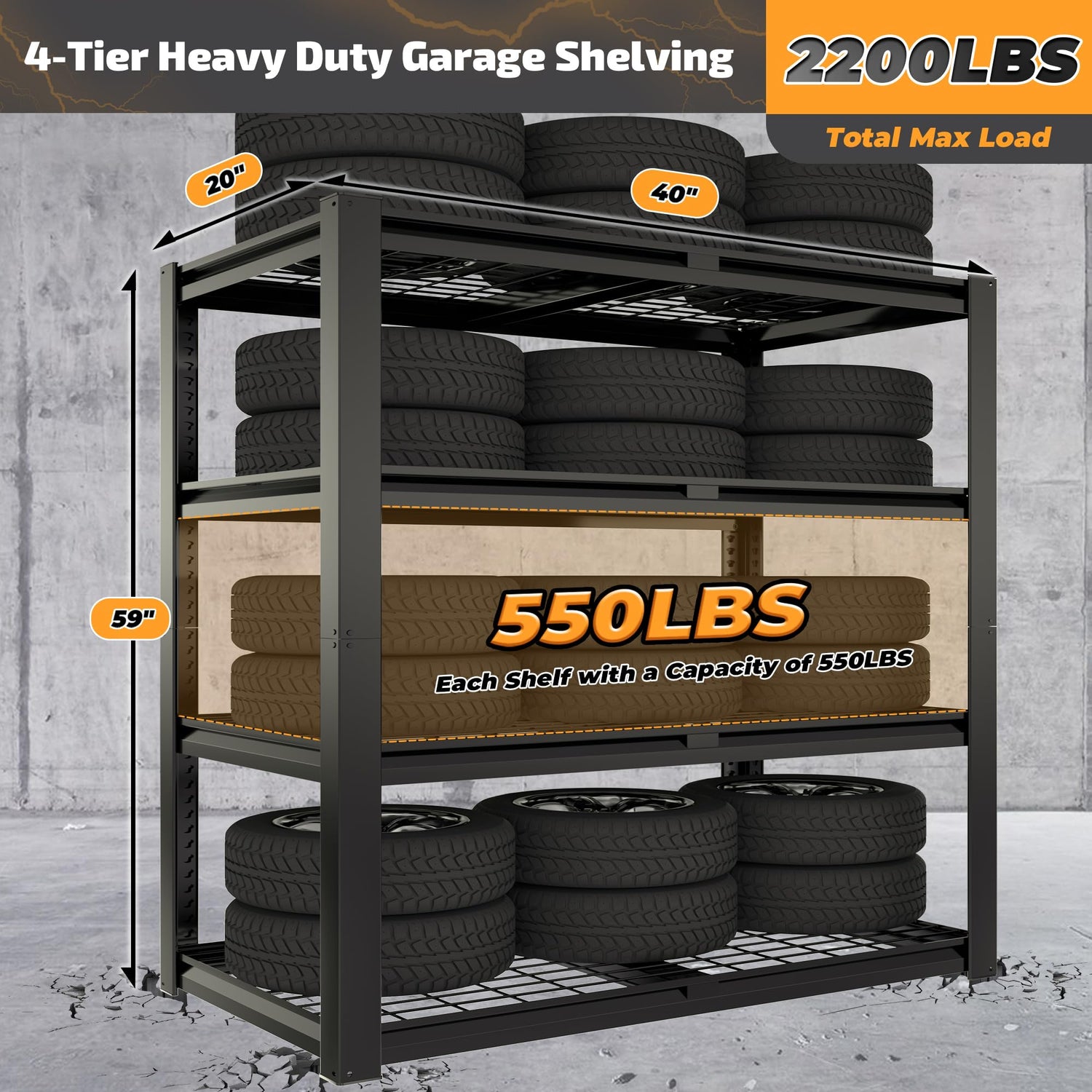 - 【Spacious Wide Garage Shelving for Storage】The heavy duty garage shelves measure 40" W x 20" D x 59" H, offering a generous storage solution that maximizes space. Made of high-quality thickened metal structure, each tier shelf can hold up to 550 lbs, with a total bearing capacity of 2200 lbs. The metal storage shelves can easily accommodate a variety of substantial heavy duty items such as tires, garage tools, dumbbells, fish tanks, storage boxes, and so on