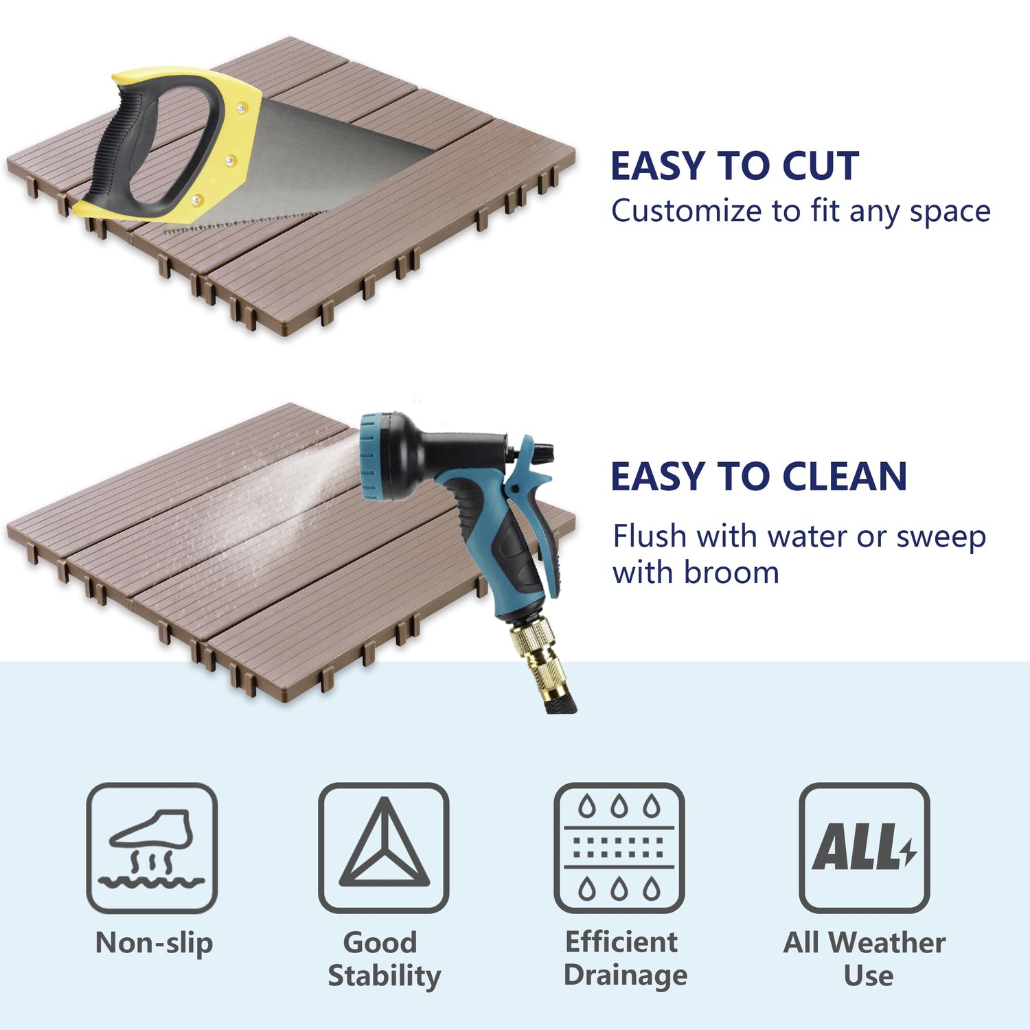 skillmaid 72 PCS Plastic Interlocking Deck Tiles - 12" x 12" Waterproof Indoor Outdoor Flooring All Weather Use, Patio Floor Decking for Porch Poolside Backyard Balcony, Brown