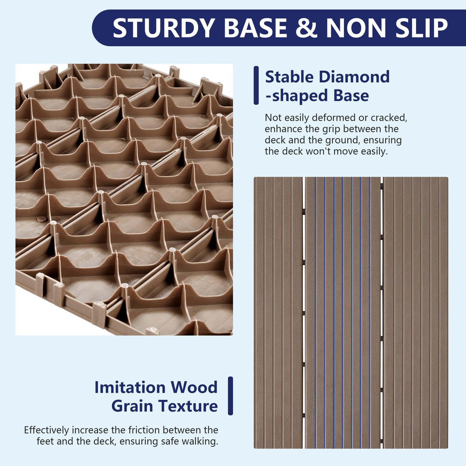 - 【Easy to Clean】Maintaining the outdoor flooring tiles is simple—just brush them with water or a broom will refresh them. The plastic decking tiles consist of 4 slats with 3 drainage channels to ensure efficient water drainage and air flow. The diamond-shaped base increases the grip between the plastic decking and the ground, preventing slipping and ensuring stability.