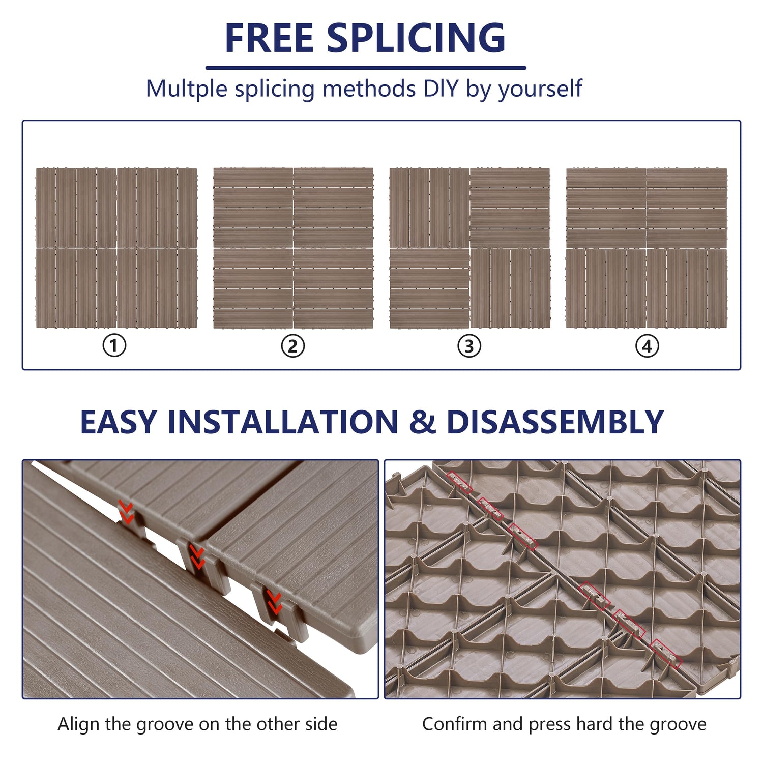 - 【Easy Installation】Featuring a snap interlocking design, these outdoor flooring connect tightly and resist separation. They can be quickly and easily installed or disassembled without any skills or tools. You can splice the plastic deck tiles into various patterns or cut them into suitable sizes to fit narrow areas, allowing you to enjoy DIY fun while creating an ideal patio space.