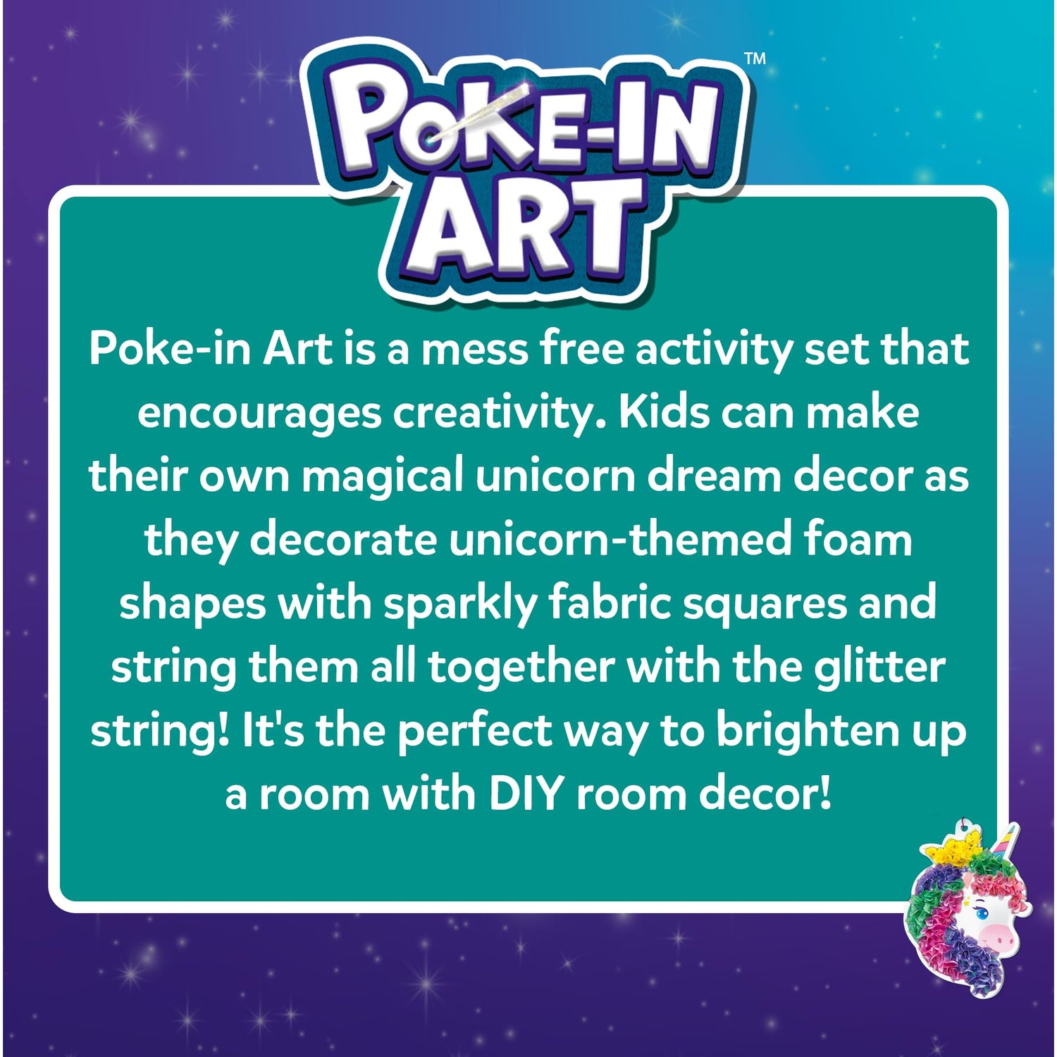 - POKE-IN ART ACTIVITY: This mess-free activity set sparks creativity as kids create their own magical unicorn dream decor by decorating unicorn-themed foam shapes with sparkly fabric squares and string them all together with the glitter string! It's the perfect way to brighten up a room with DIY room decor!