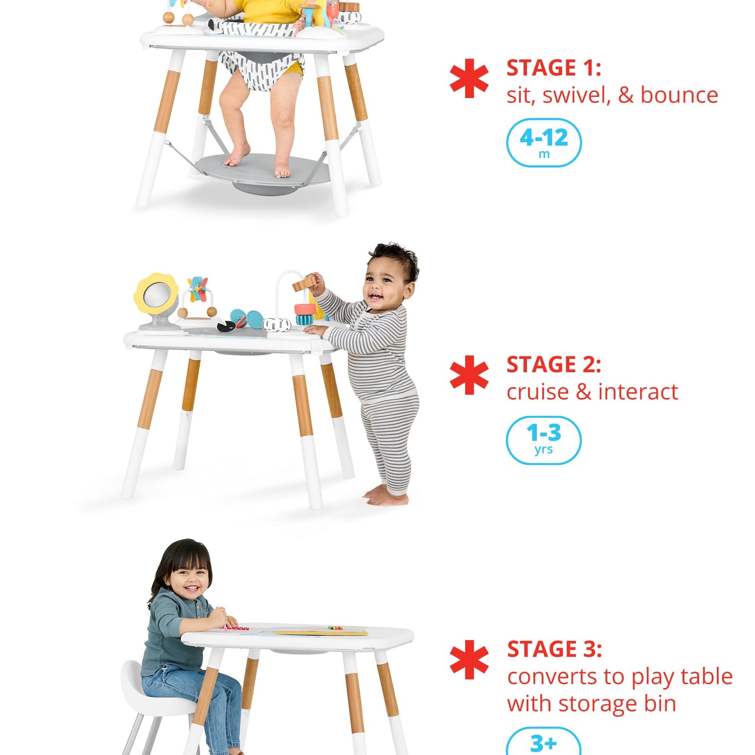 - Three-stage grow-with-baby design: Our activity center grows with your little one through three stages. Sit, Swivel, Bounce & Play; Cruise & Interact; and Play Table mode. In Stage 1 (4-12 months), the 360-degree rotating seat and movable toys encourage exploration and customization. Stage 2 (1-3 years) supports new walkers with adaptable toys for balance and stability. Finally, in Stage 3 (3+ years), it converts into a play table, providing a creative space for your toddler