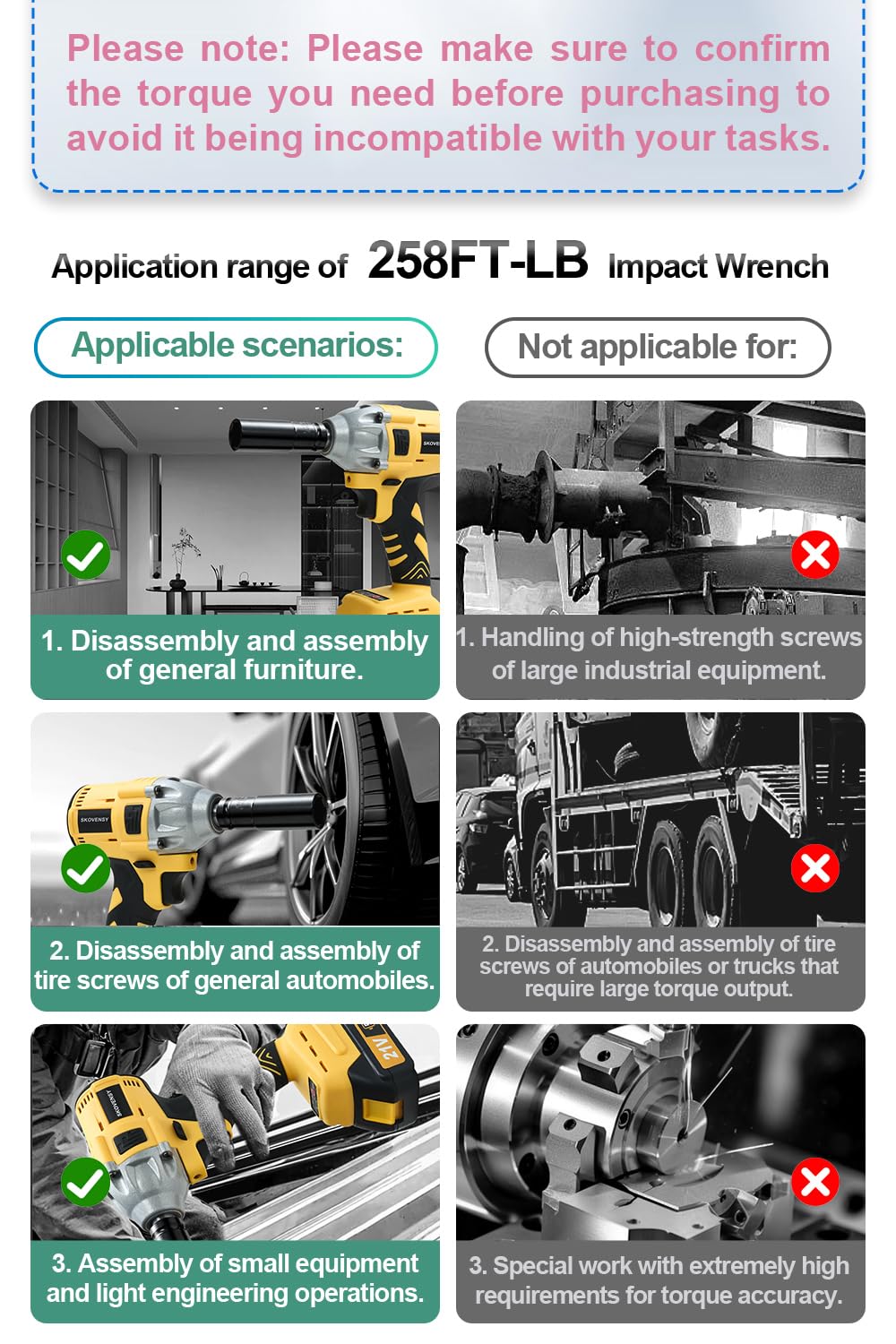 - 【Cordless Impact Wrench with Variable Speed & Reversible Function】This tool features 258ft-lb(350N.m)torque and 2800rpm max speed. Its reversible function changes rotation direction with automatic stop in reverse mode. Ideal for furniture assembly, car tire bolts, small equipment, and light engineering. Not suitable for high-strength bolts in large industrial equipment or tasks requiring high torque precision.If used for these purposes, please select other products.