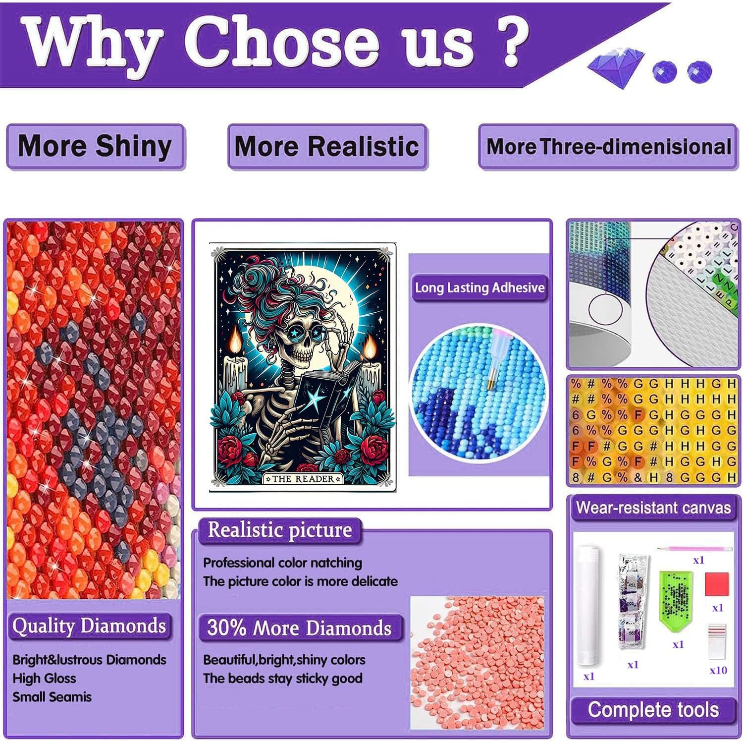 - Quality Diamonds: Diamonds of skull diamond art kits for adults accessories are made by precision machines with uniform shapes and precise colors. We add 30% more diamonds to each diamond painting set to ensure you have enough diamonds to complete your artwork