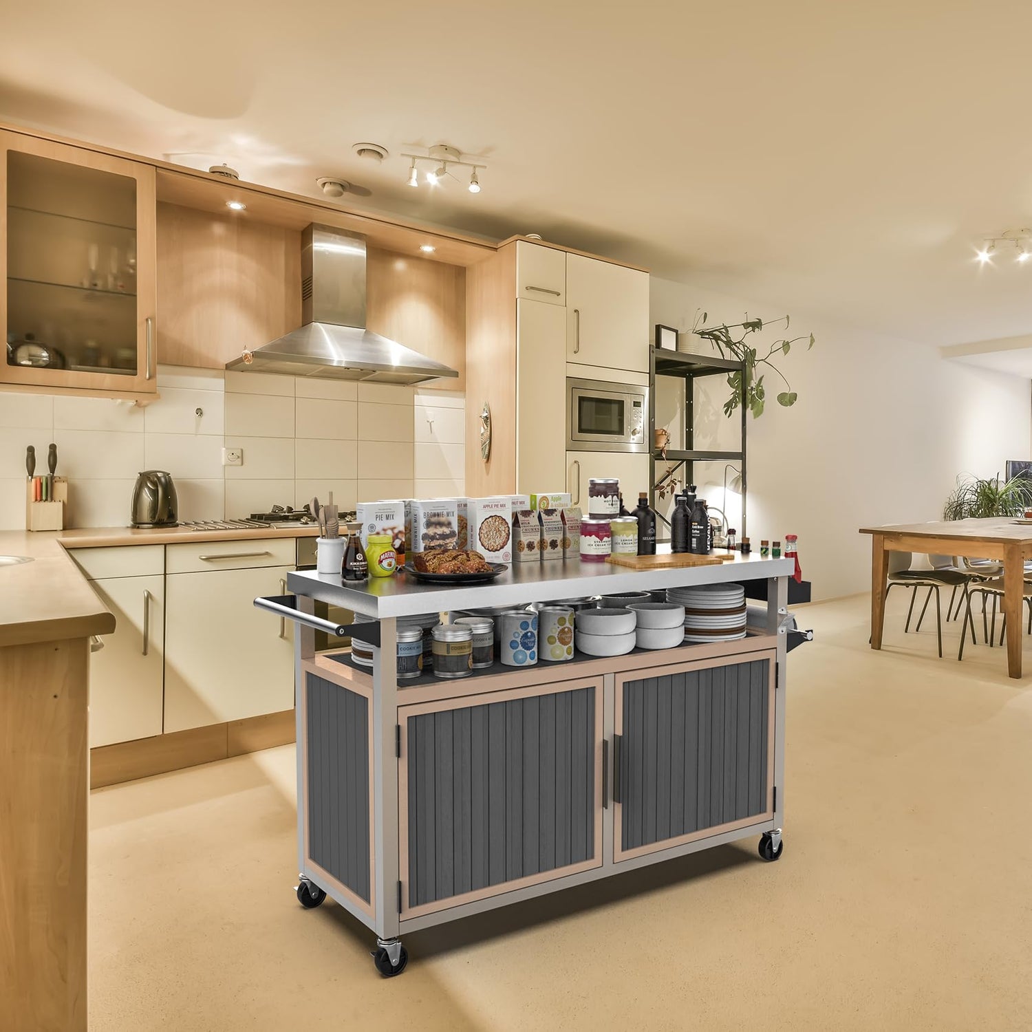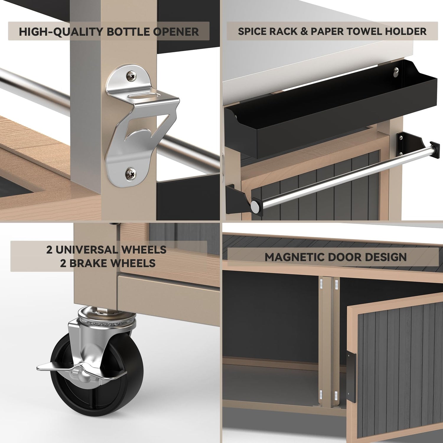 - Practical Features: The serving cart is outfitted with a spice box, a paper towel holder and a fixed bottle opener, offers a large food prep surface for efficient cooking and serving.