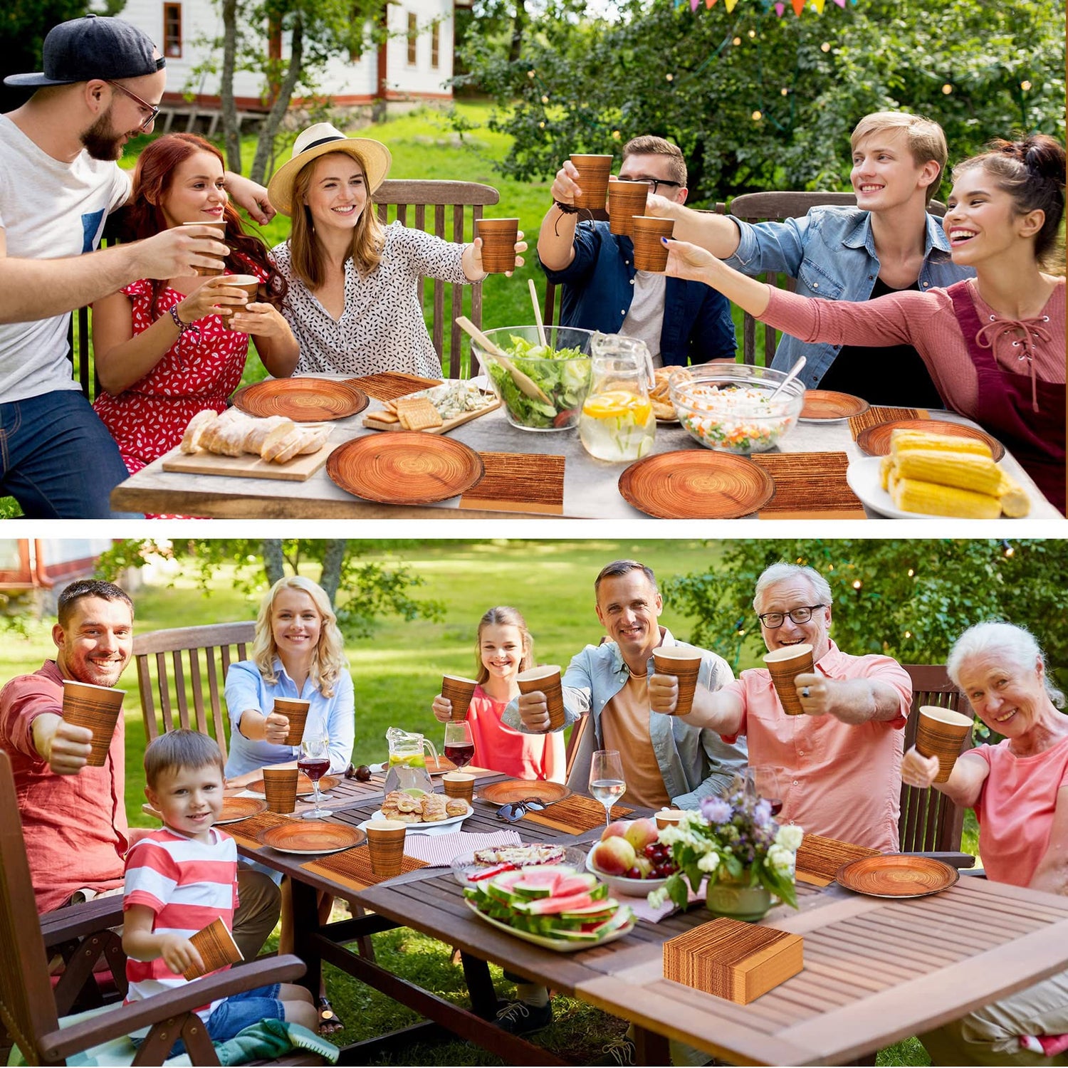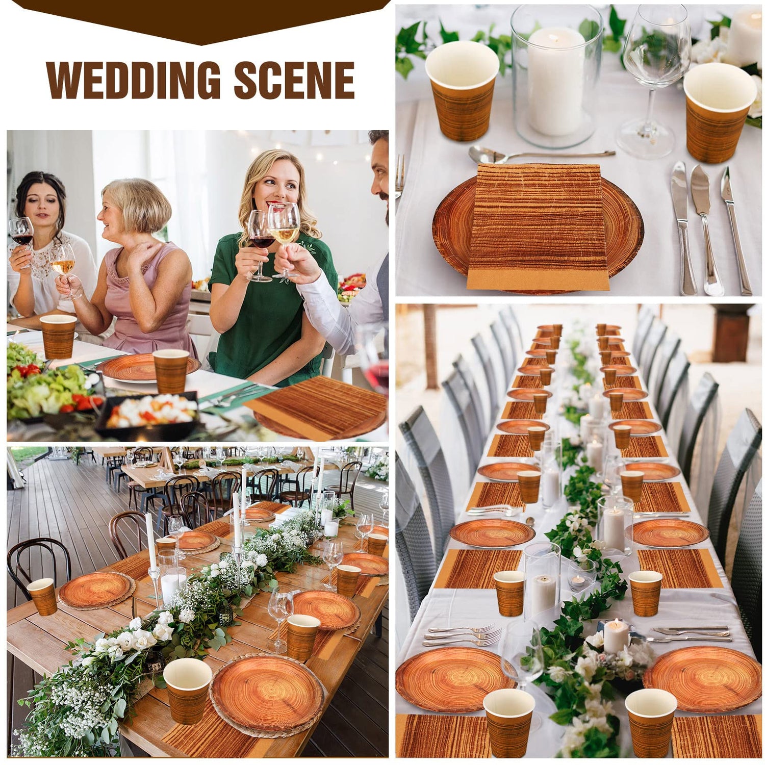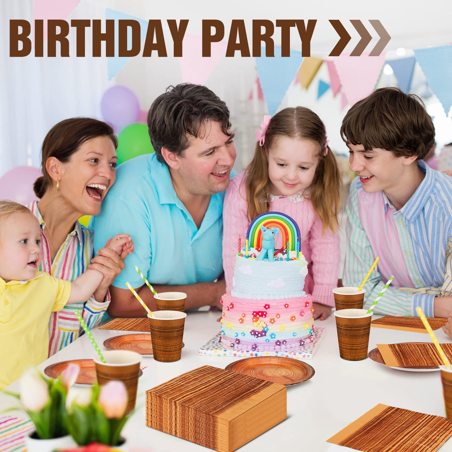 - Camping Birthday Party Supplies Kit: the package includes 50 pieces of 9 inch wood grain paper plates, 100 pieces of rustic wood slice napkins in about 6.5 inches (when folded), and 50 pieces of 9 oz farmhouse wood slice paper cups, the nice combination and sufficient quantity can meet your party and daily needs