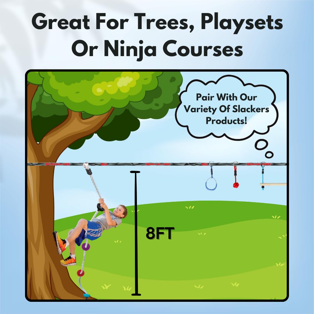 - SAFETY FIRST - At slackers, we are focused on creating safe, reliable obstacle course equipment, ideal for building up your inner ninja warrior. Our Ninjaline accessories are rated ages 5+ and hold up to 250 LBS.