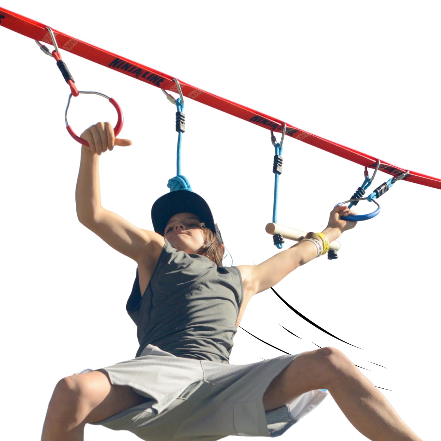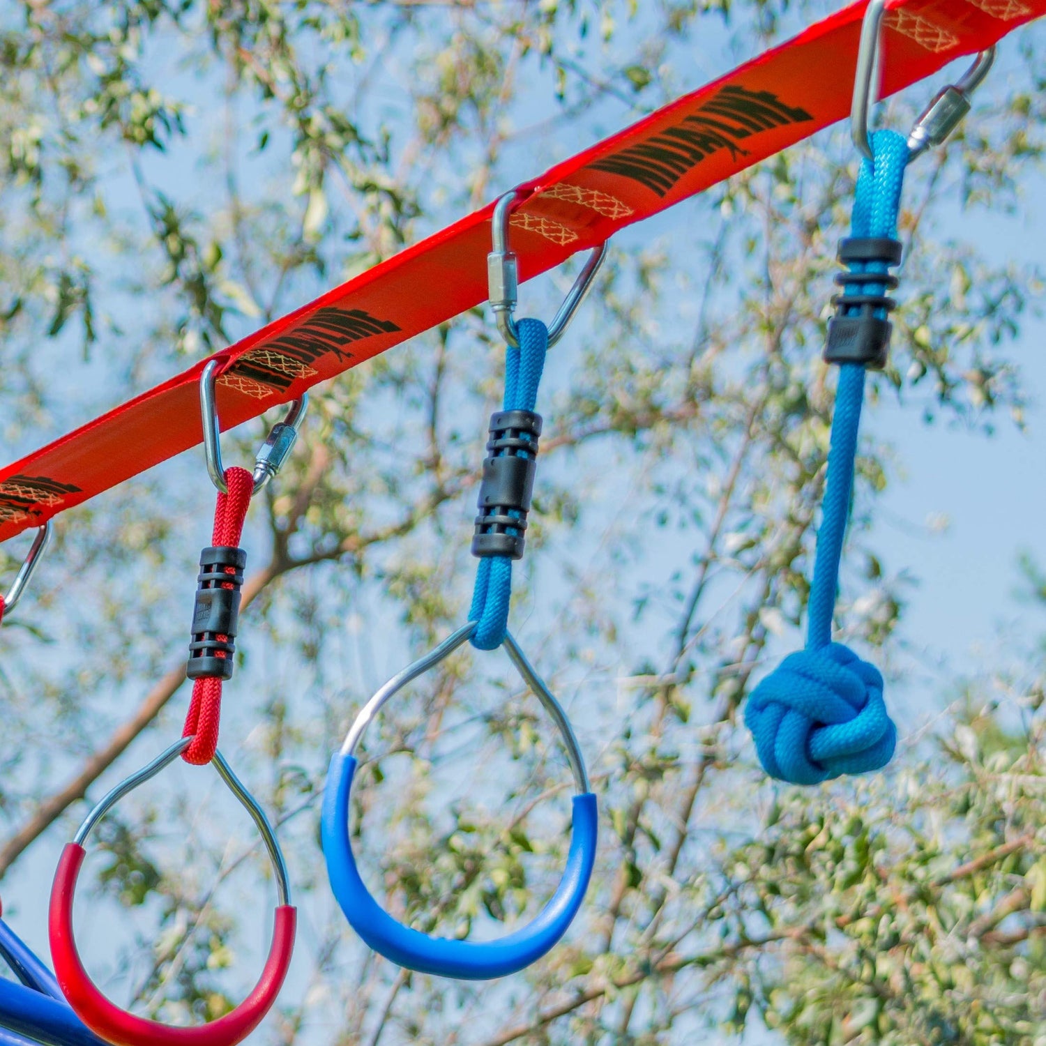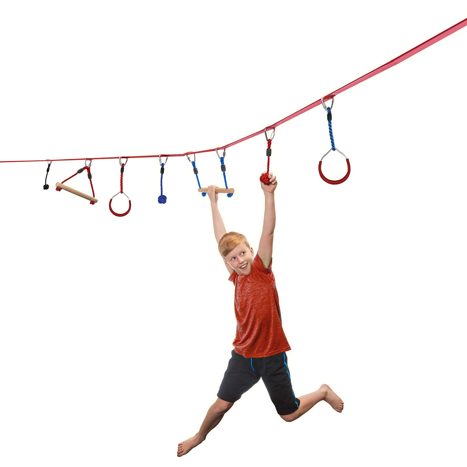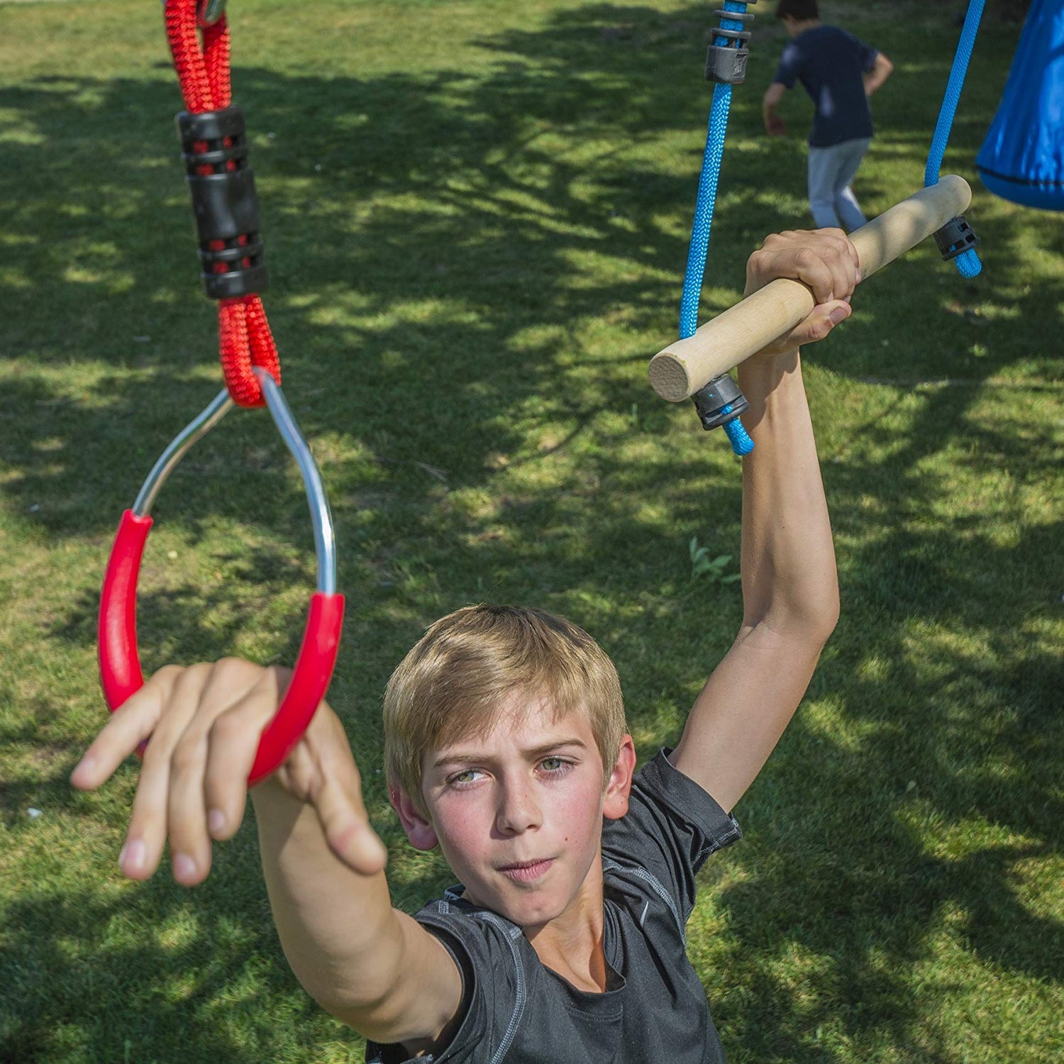 - Ninja Training with seven obstacles including: a three piece 10" x 2.5" nylon rope knows, two piece 16" monkey bar holds with triangle safety carabiners, and two gymnastics rings with textured finish