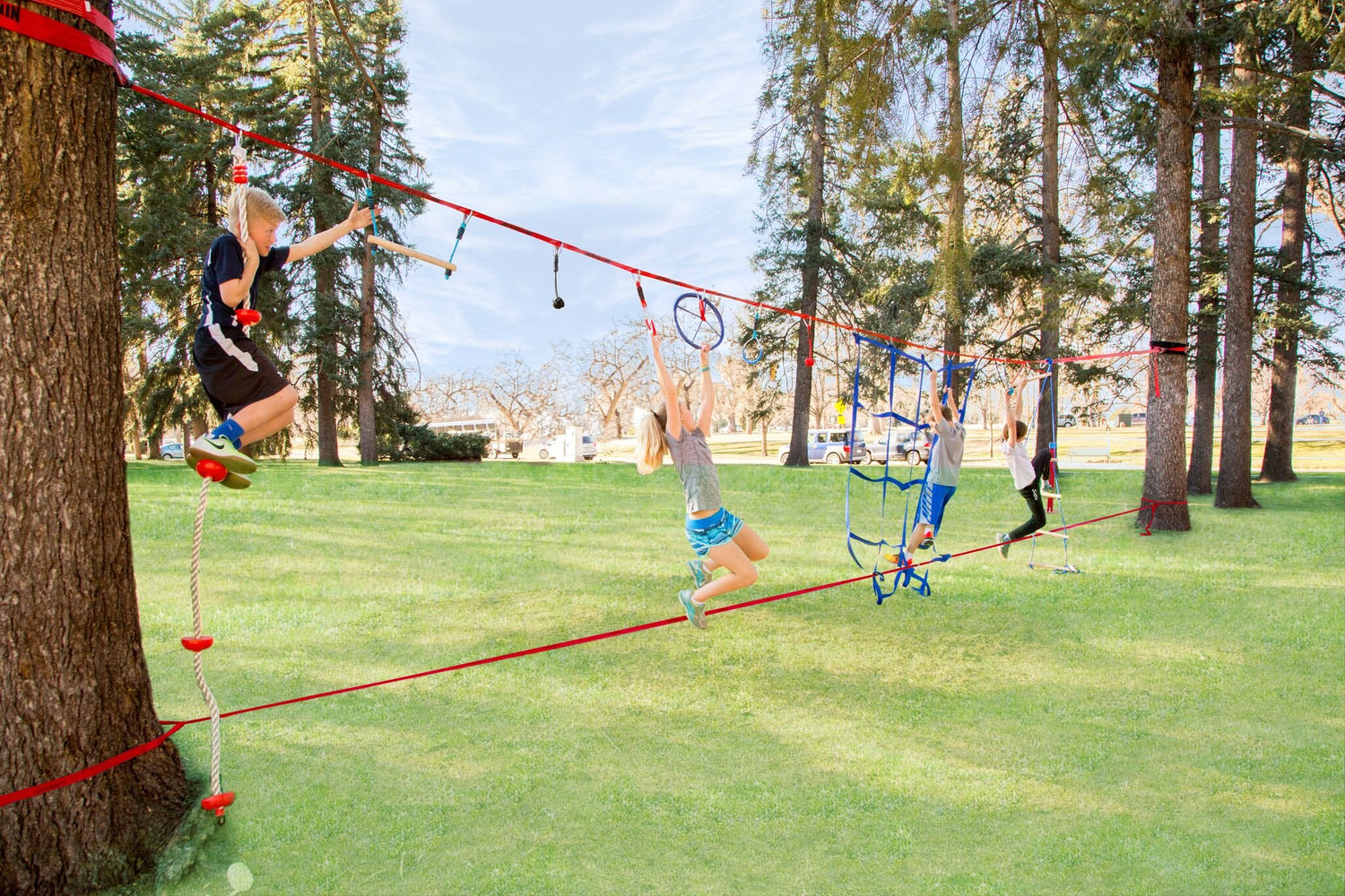 - Hang 30' 2" Slackline webbing between two posts or healthy trees