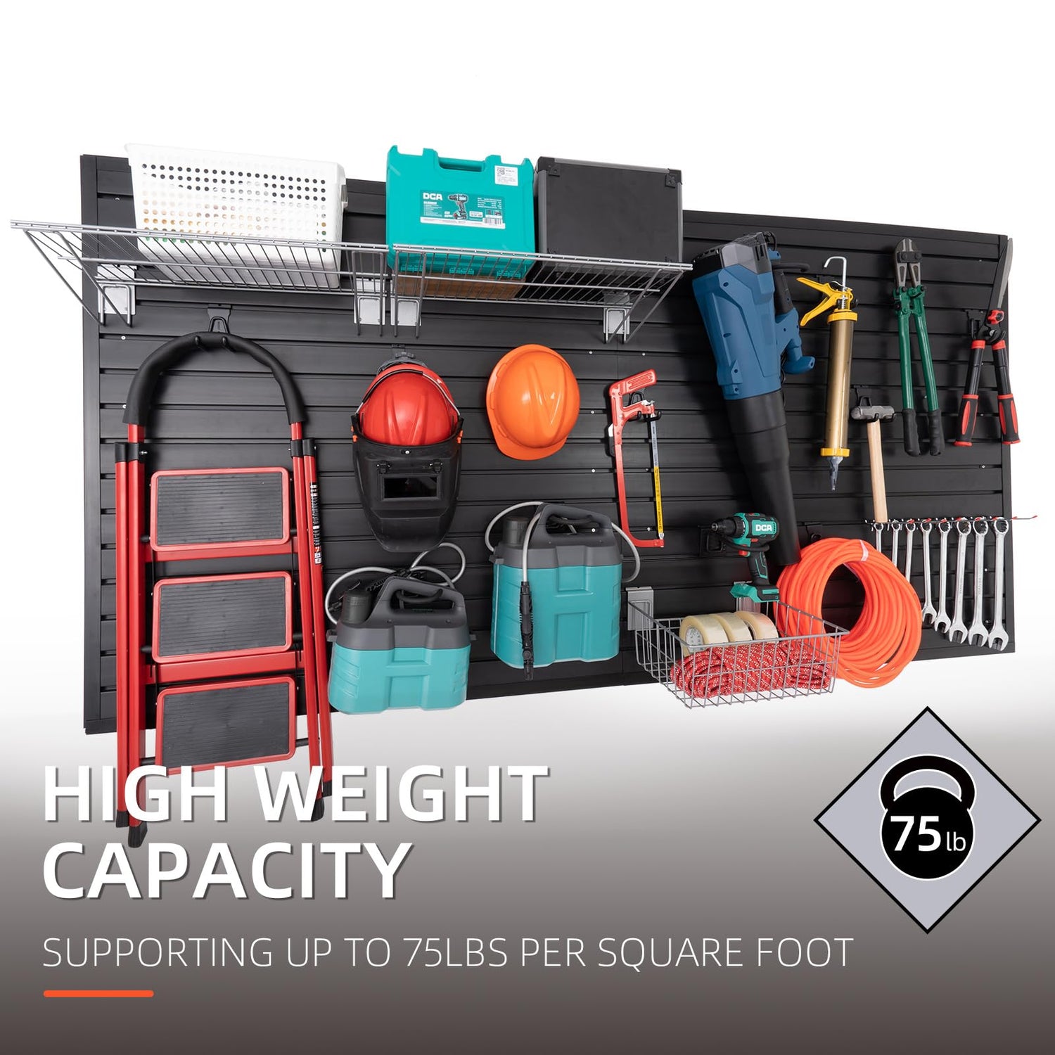 - MAKE FULL USE OF YOUR SPACE: Unleash the true potential of your garage wall organizer for tools with the garage slat wall panel. By making smart use of vertical wall space, you can revolutionize your garage into a seamlessly organized and efficient area. Bid farewell to a messy garage and welcome a meticulously optimized space that maximizes every inch available. Enjoy effortless access to your tools, equipment, and accessories, all while crafting a visually captivating environment.