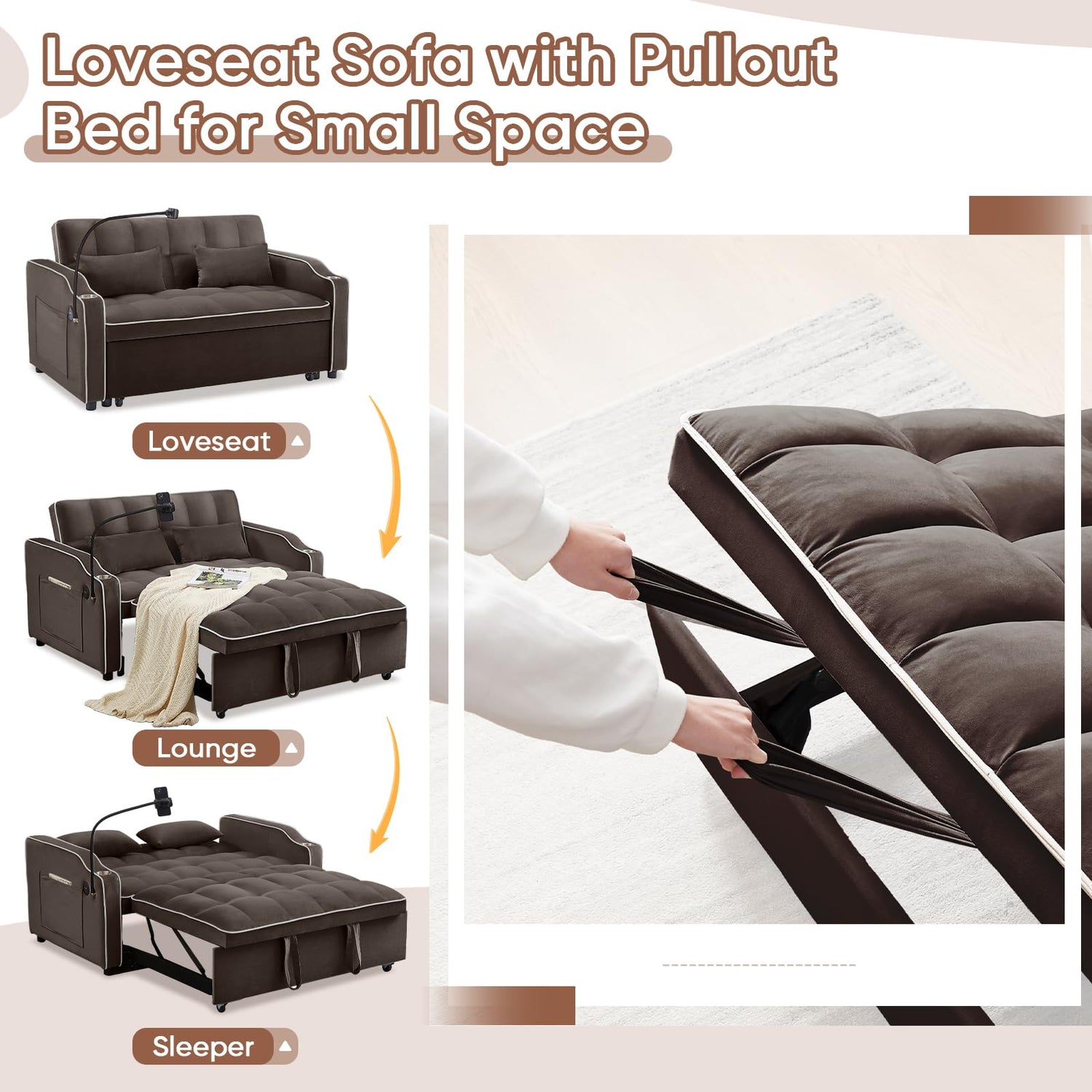 Sleeper Sofa Couch Bed with USB & Type C Port, Modern 3-in-1 Convertible Velvet Pull Out Loveseat Futon Sofa w/Phone Holder/Cup Holder for Living Room Apartment, Adjustable Backrest, Coffee