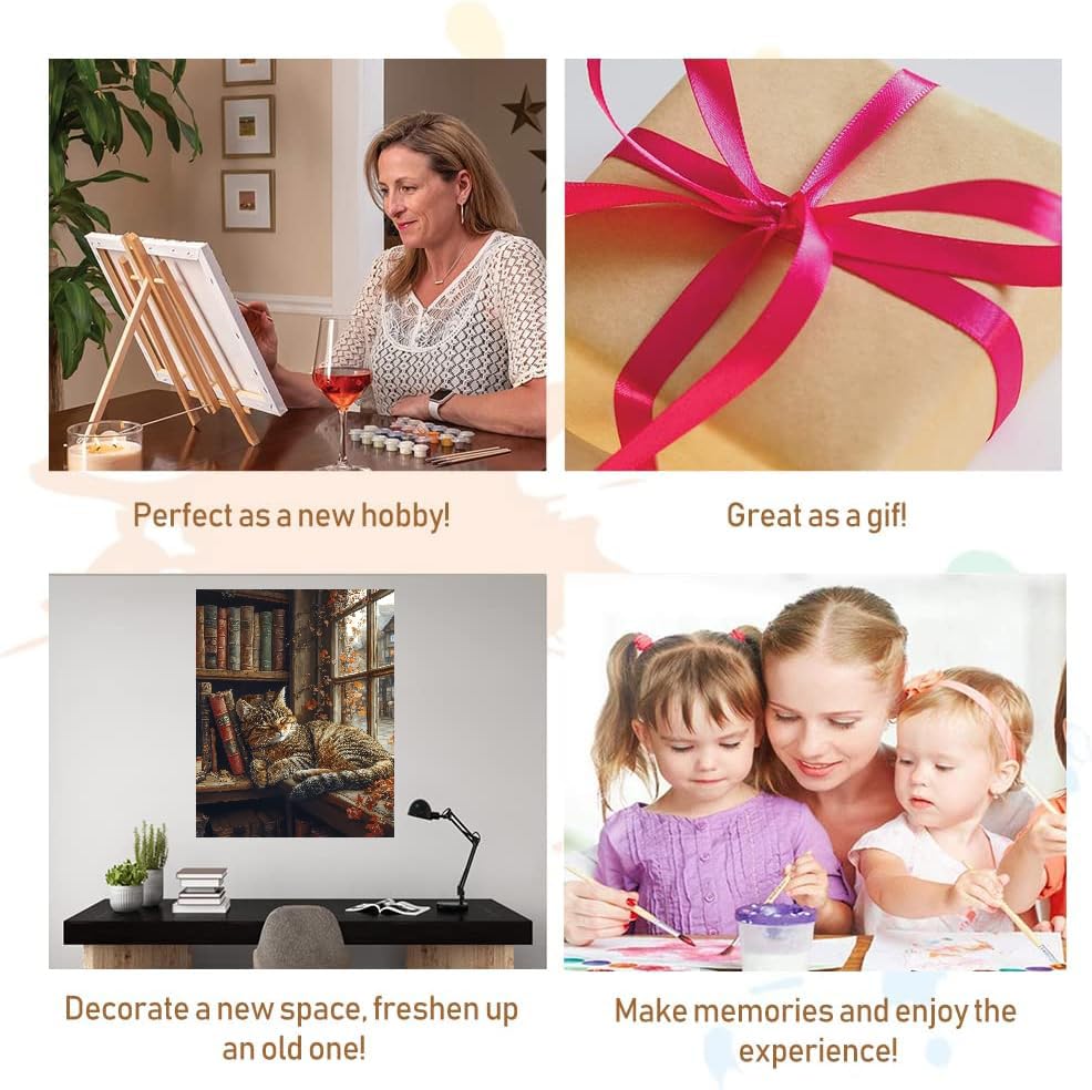 Sleeping Cat Paint by Numbers Kit for Adults - Bookshelf Paint by Numbers for Adults Beginner, DIY Acrylic EasyPainting by Number on Canvas Home Wall Decor 16”W x 20”L