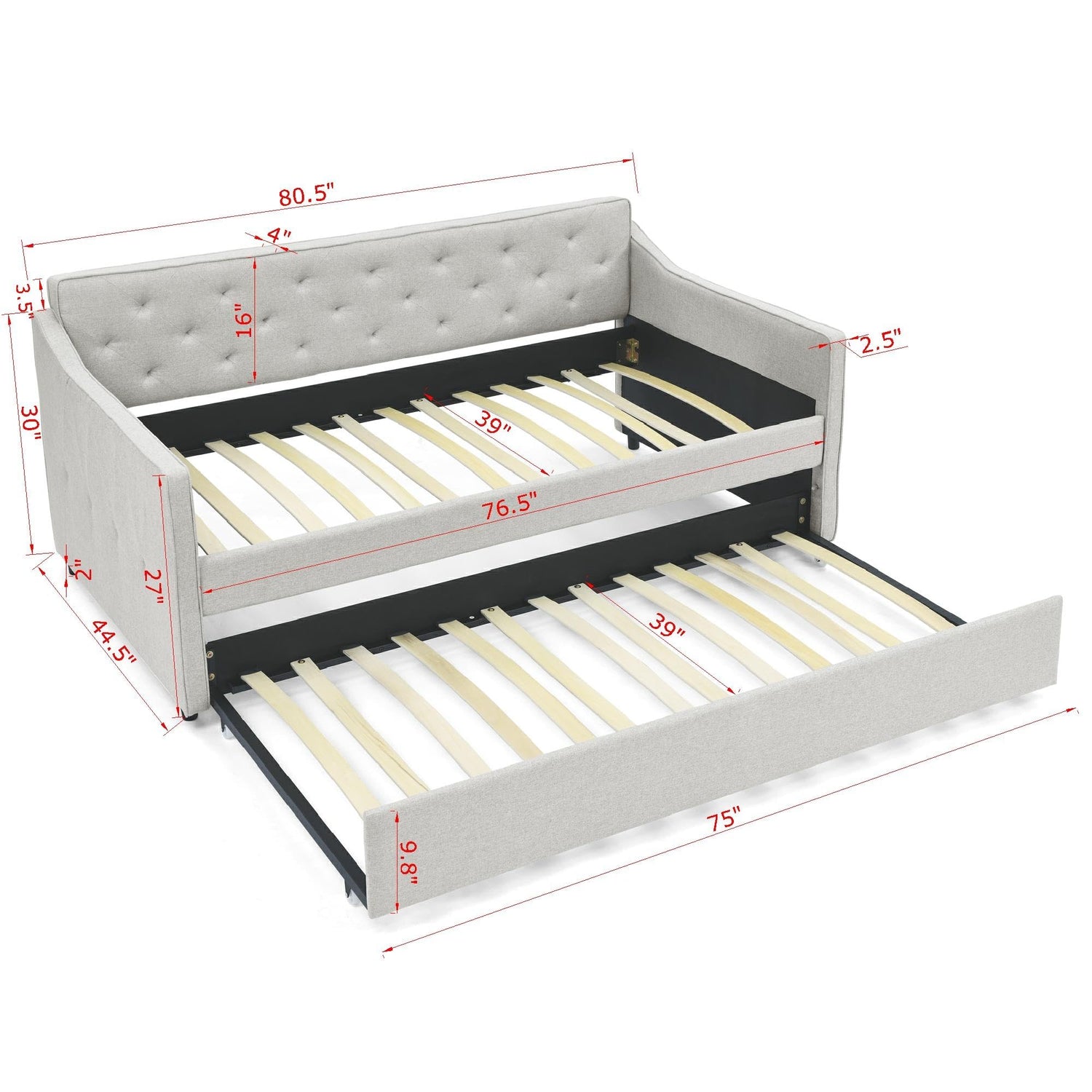 - 【Overall size】80.5''x44.5''x33.5'' Daybed Size:75x39 inches Trundle size : 75x39 inches No Mattress Included.This elegant upholstered trundle daybed comes with the necessary hardware and clear instructions to guide you through every step
