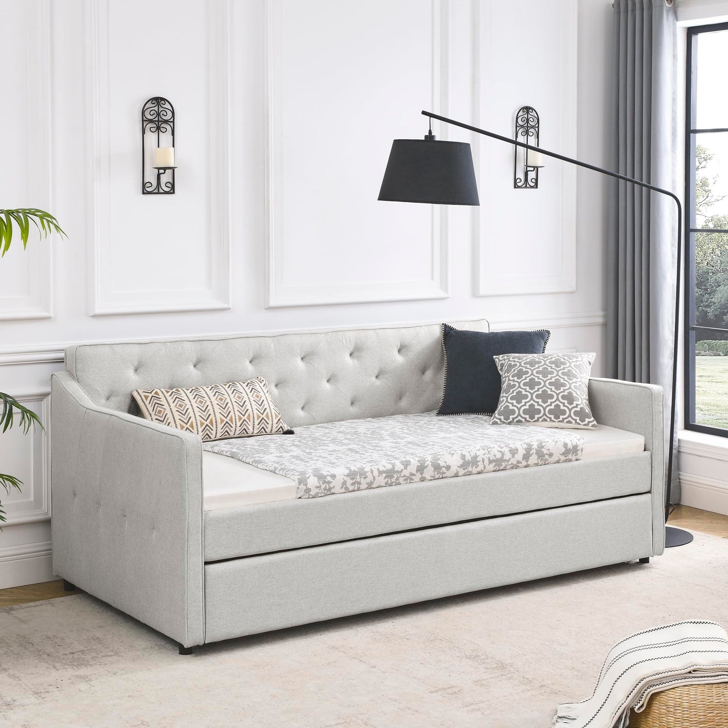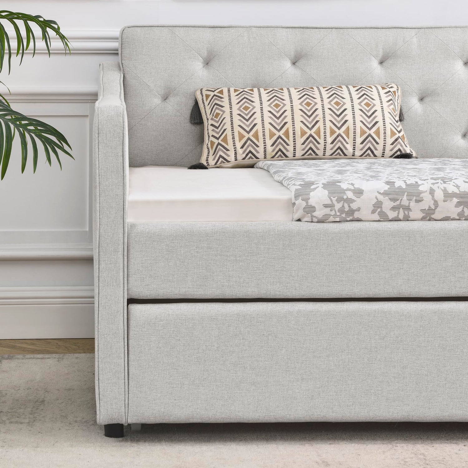 Details: SLEERWAY Daybed with Trundle, Linen Upholstered Tufted Twin Size Day Bed Pull-Point Sofa Daybed Frame with Twin Roll-Out Trundle, No Box Spring Needed, Furniture for Bedroom, Living Room, Beige
