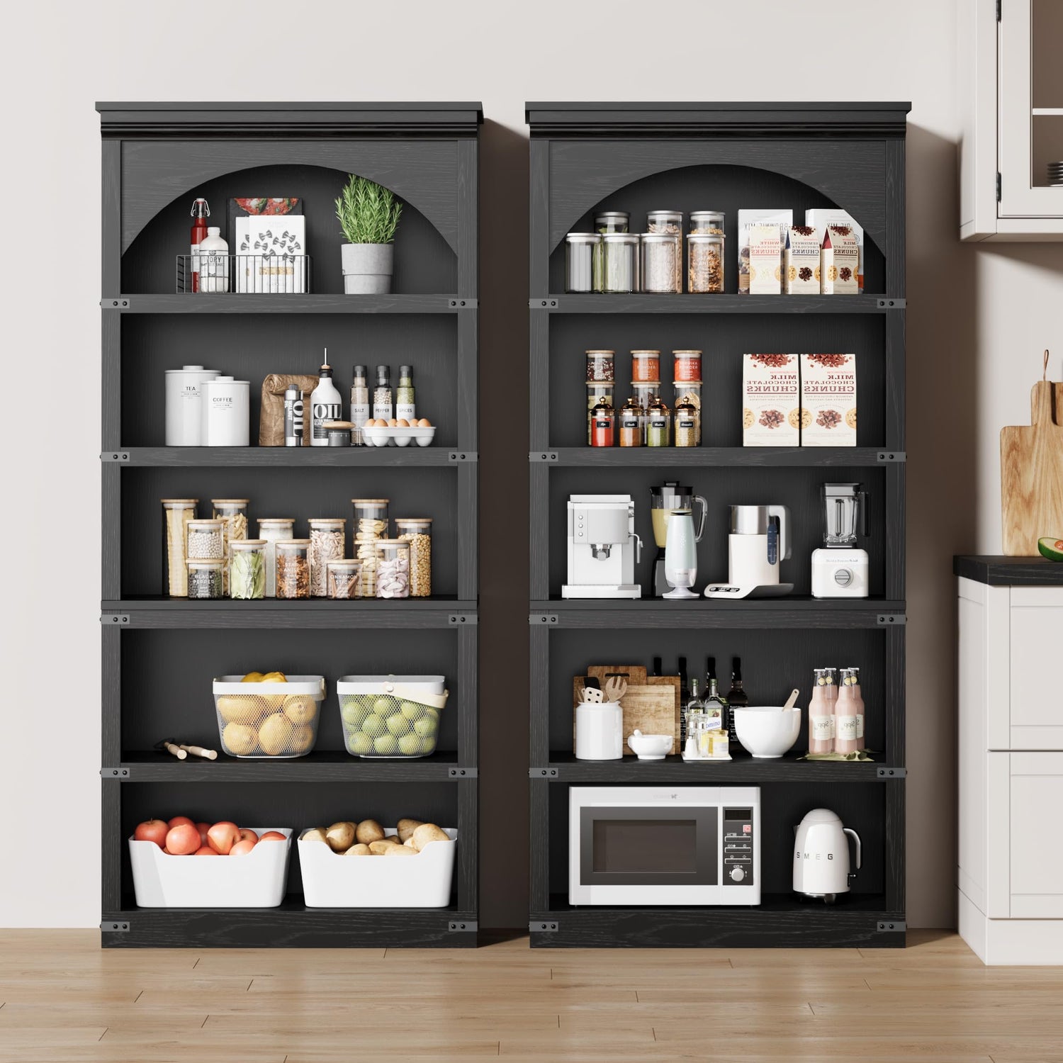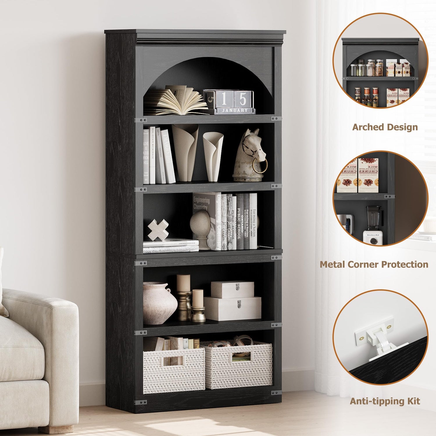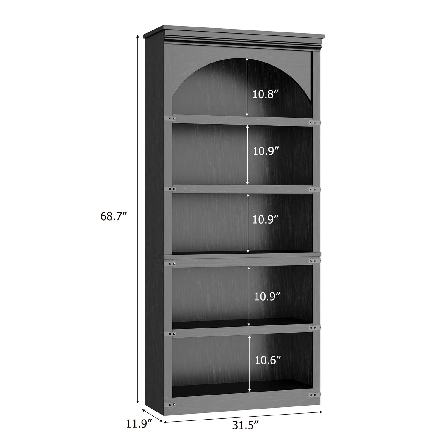 - [Storage Space] Overall dimensions: 11.9"D x 31.5"W x 68.7"H. This farmhouse tall arched bookshelf has 5 open shelves that maximize vertical storage space while keeping your daily essentials organized