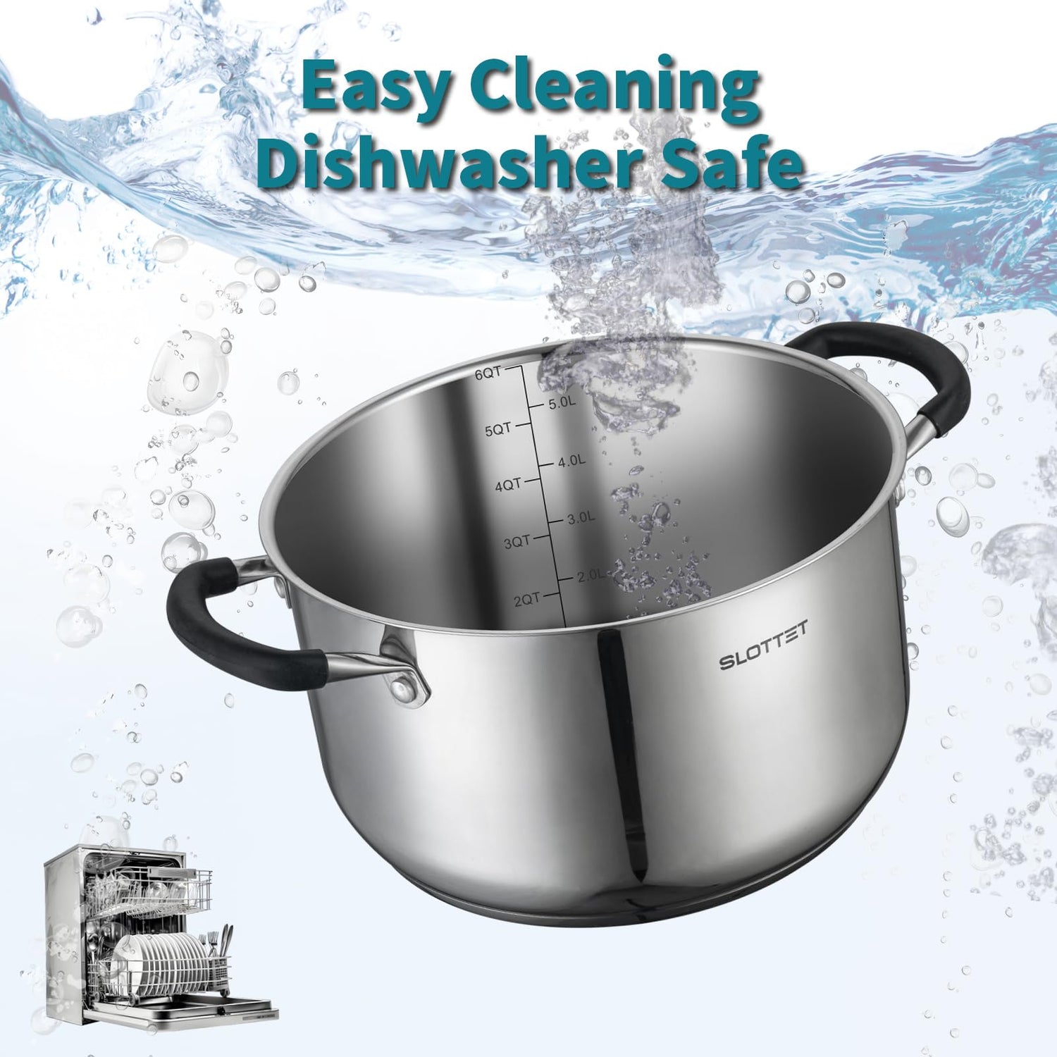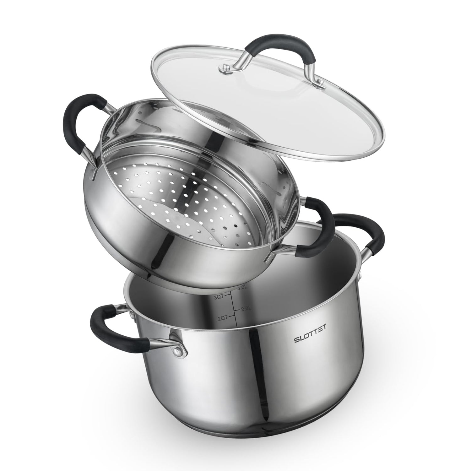 SLOTTET 6 Quart Stainless Steel Stock Pot with Steamer,6 Qt Multipurpose Stockpot with Stay-cool silicone Handle and Glass Lid,Soup Pot for Cooking