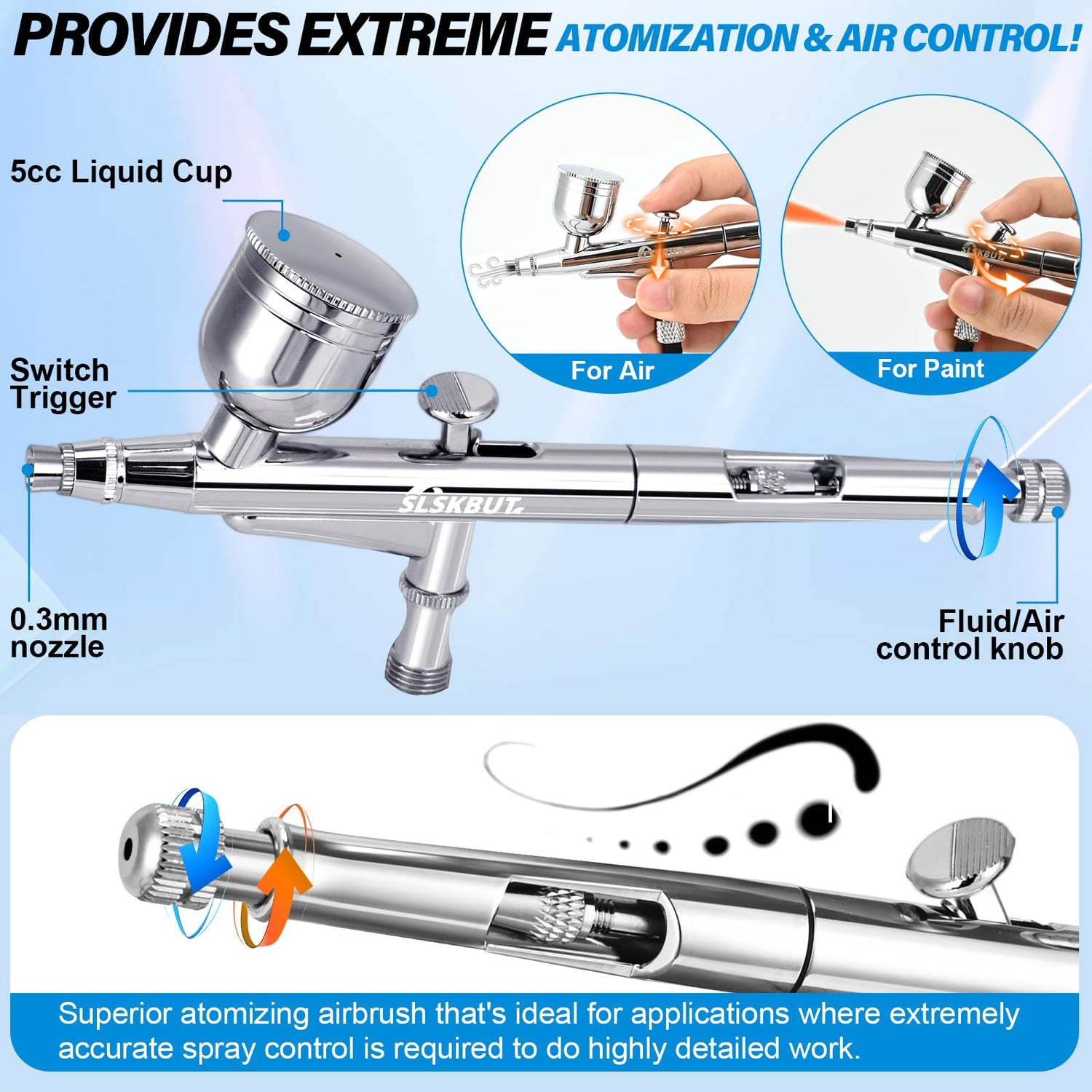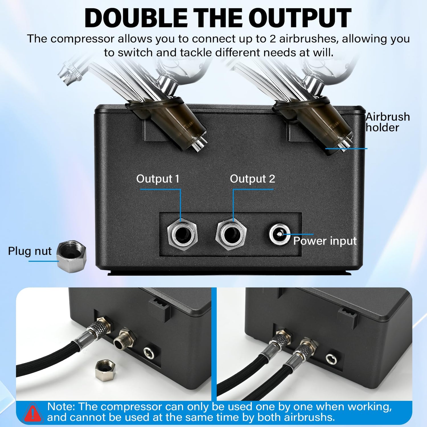 - Double the Output & Fine Detail Nozzle: Boost efficiency! Our compressor lets you connect two airbrushes simultaneously for seamless transitions. airbrush gun set features a precise 0.3mm nozzle, ideal for ultra-fine lines (down to 0.5mm) and broad coverage up to 5cm, ensuring detailed and expansive work.