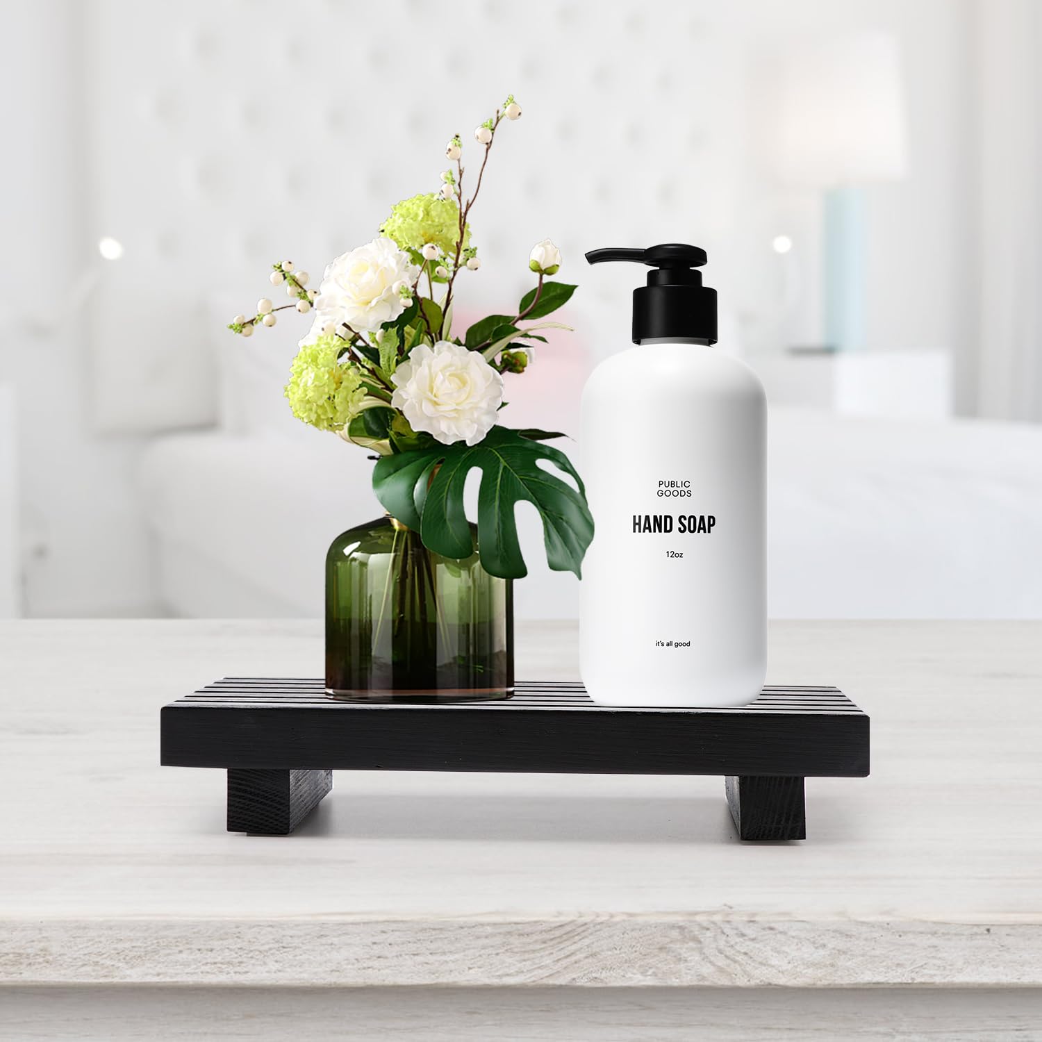 Small Bathroom Counter Organizer Tray Decorative Wood Display Pedestal Stand Kitchen Counter Soap Tray Wooden Risers for Bathroom Sink Accessories Vanity Black Bathroom Decor Dish Soap Holder