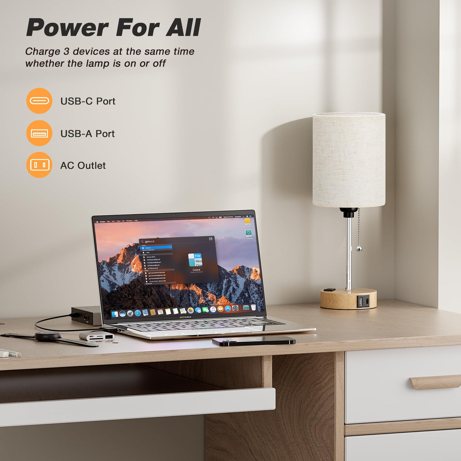 Small Bedside Lamp for Bedroom Nightstand - Table Lamp with USB C and A Port, Pull Chain Bed Lamp with AC Outlet, Nightstand Lamp with Wood Base for Kids Reading, Desk Lamp for Living Room/Dorm Room