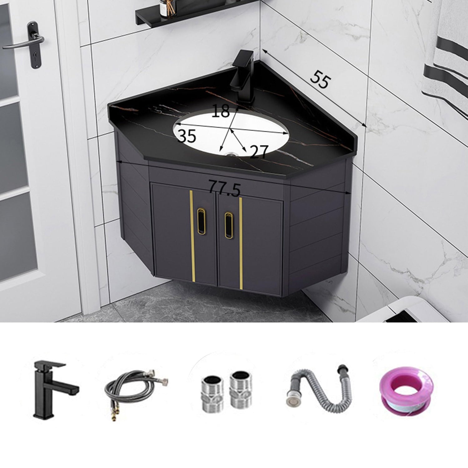 - 【Wall-mounted Design】 The floating bathroom vanity with sink offers a wall-mounted integrated design,and solving the problem of moisture at the bottom of the cabinet,it also provides additional storage space. Its classic triangle shape allows for easy installation in any corner,great for small bathroom or powder room. (wall drilling is required).