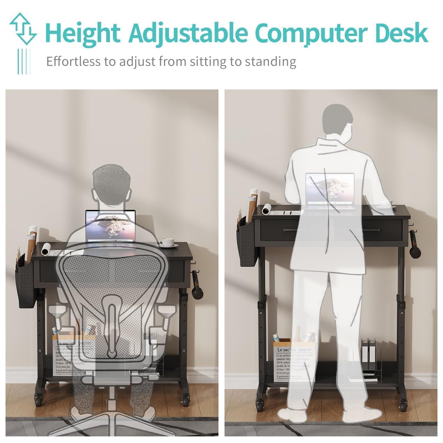 Small Portable Rolling Standing Desk - 32 Inch Adjustable Mobile Stand Up Teacher Desks with 2 Fabric Drawers on Wheels for Classroom, Couch Sofa Side Laptop Table with Storage for Home Office, Black
