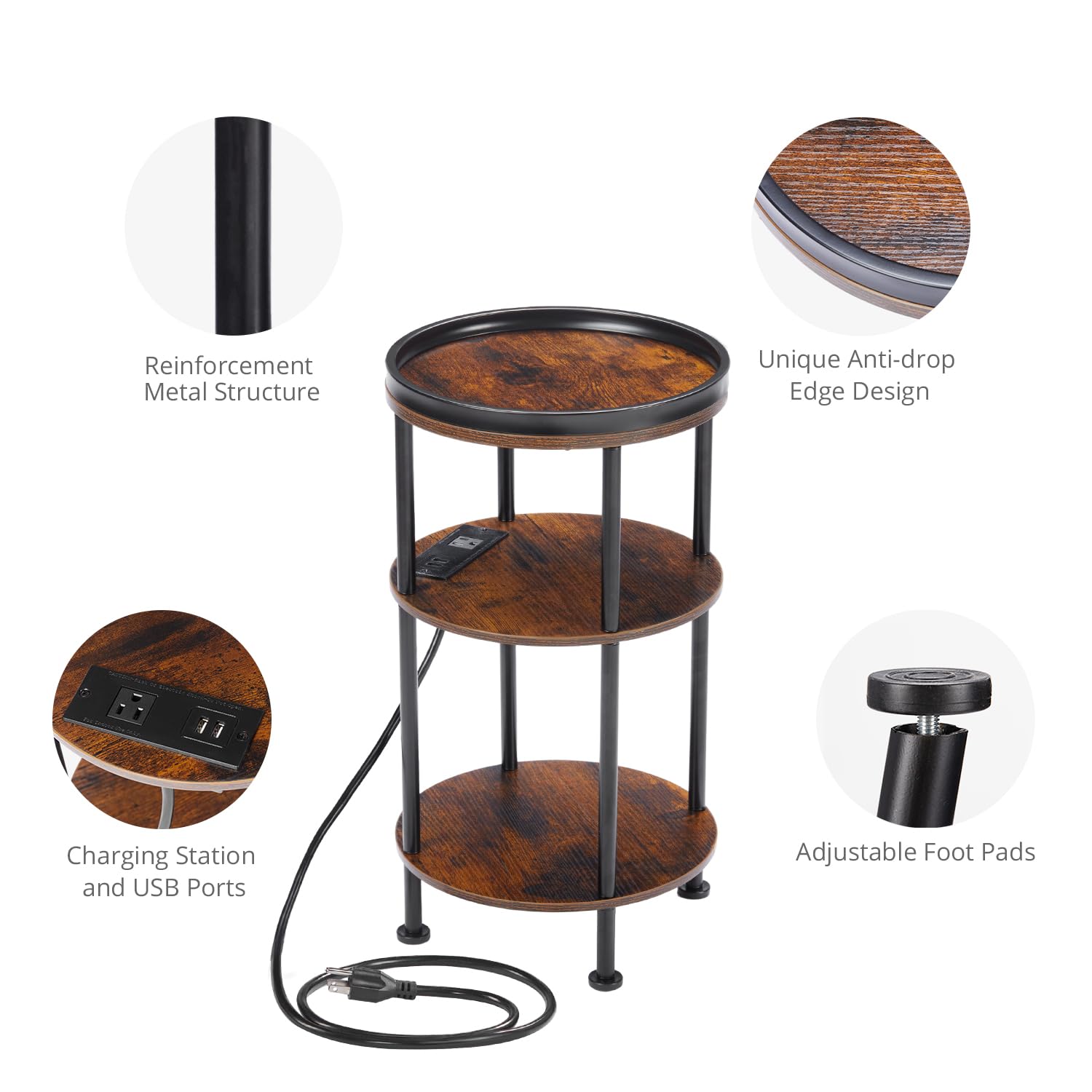 Small Round Side Table with Charging Station for Small Spaces, 3-Tier Round Accent Table with USB Ports & Power Outlets, Round Corner Table Tea Sofa Side Table for Living Room Bedroom (Rustic Brown)