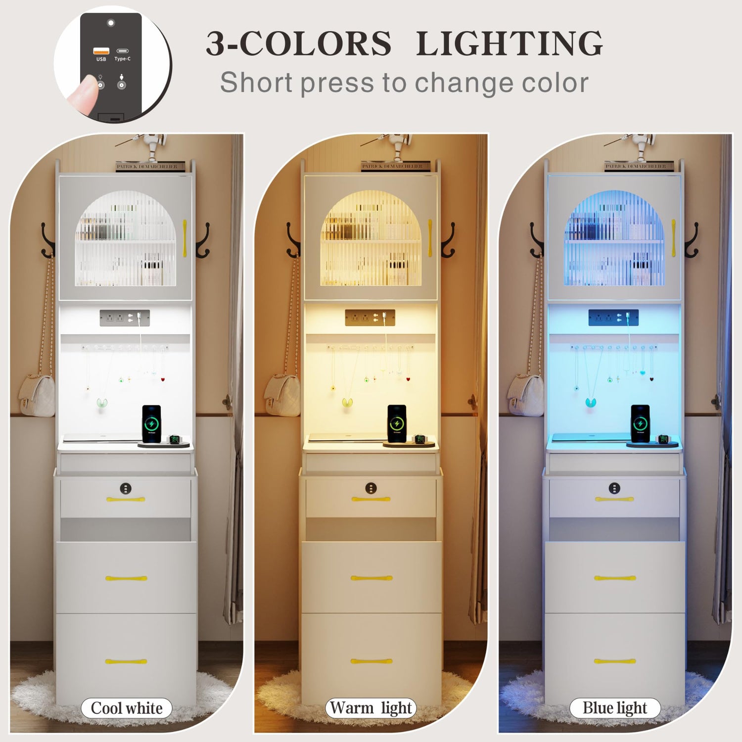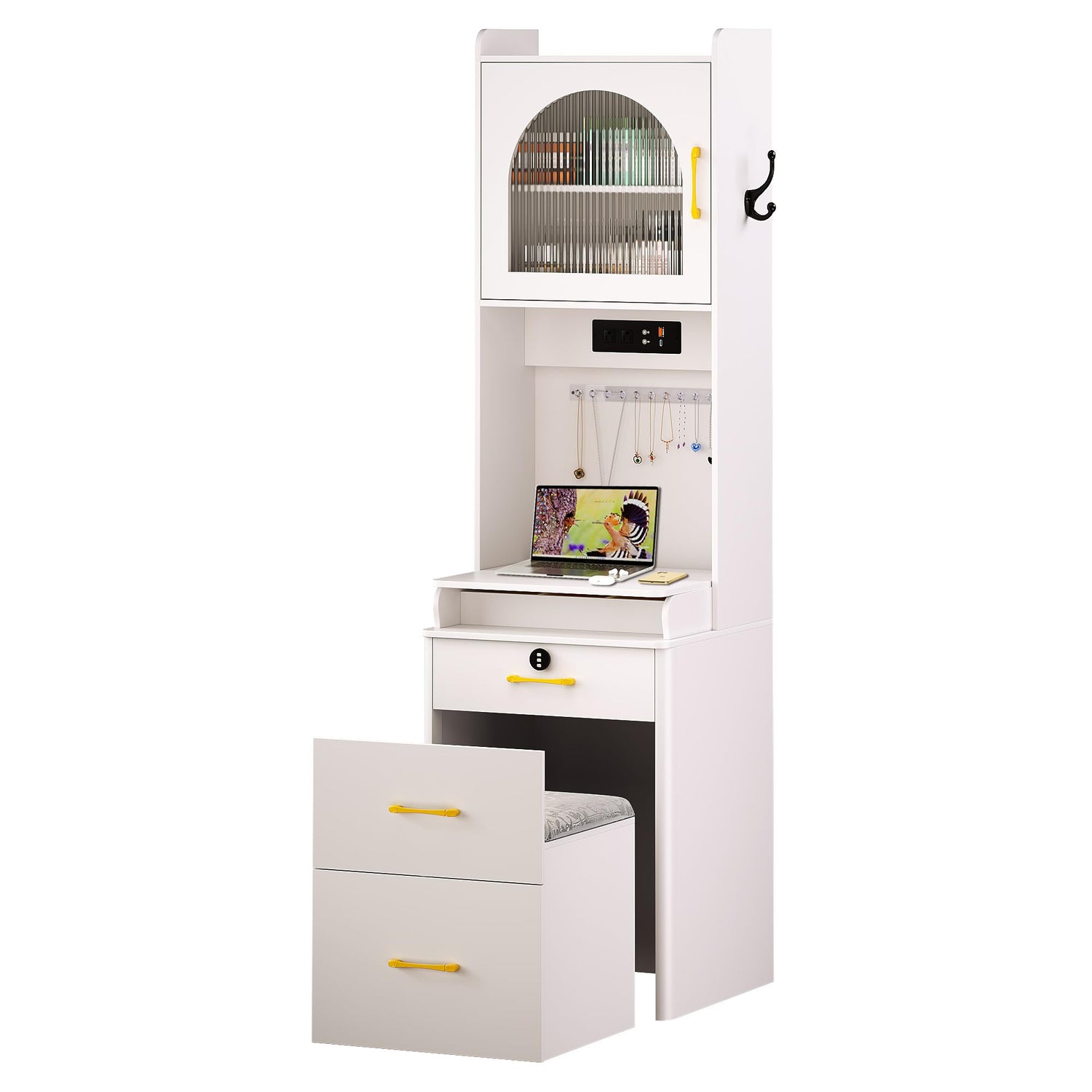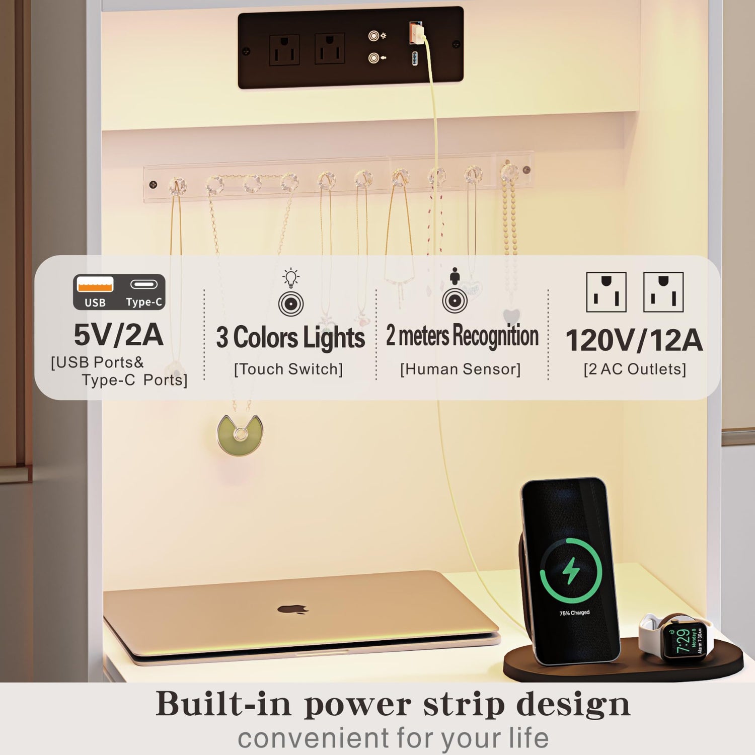 - 【Multi-functional design】: Featuring a flip top mirror and 3 Colors LED lights, it provides convenient makeup application. Additionally, it includes a charging station, human motion Sensing, storage dresser, concealed chair, acrylic hook, catering to various needs.
