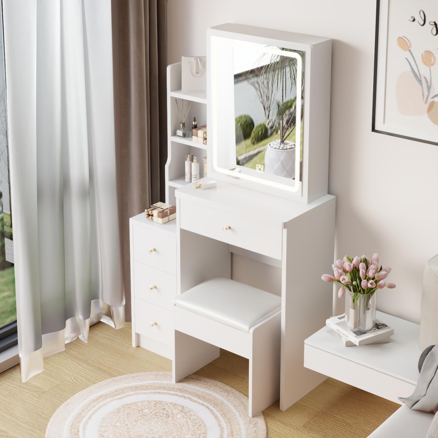 • [Vanity Desk with Mirror and LED Lights]: This makeup vanity is equipped with a built-in LED touchscreen light.with a simple tap you can choose the light color from white light, natural light, and warm light.The soft and adjustable illumination creates a perfect ambiance for your makeup application or any other activities at the dresser.
