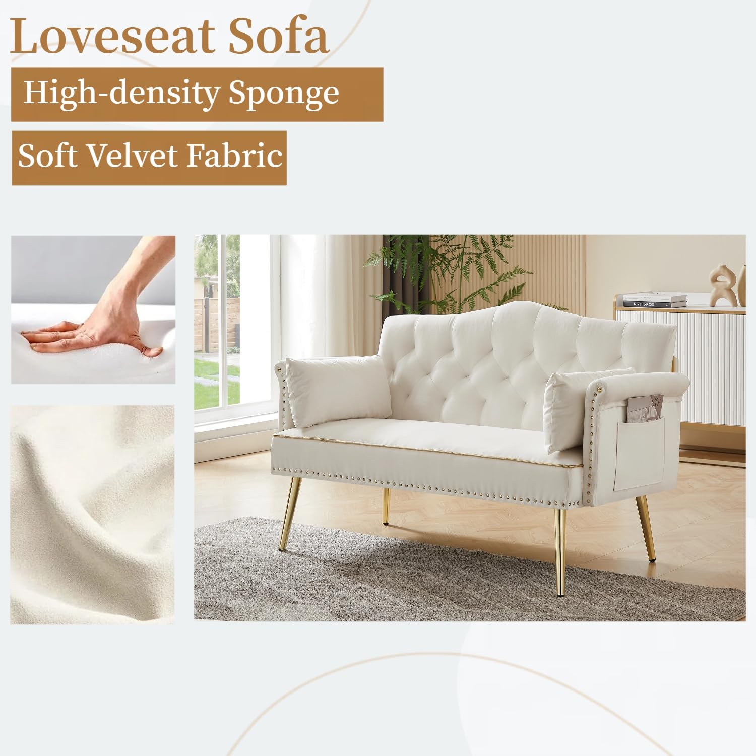 Small Velvet Loveseat Sofa with Gold Metal Legs,55-inch Modern Sofa Couch with 2 Side Pockets,Couch with Tufted Backrest for Living Room Bedroom Office (Beige)