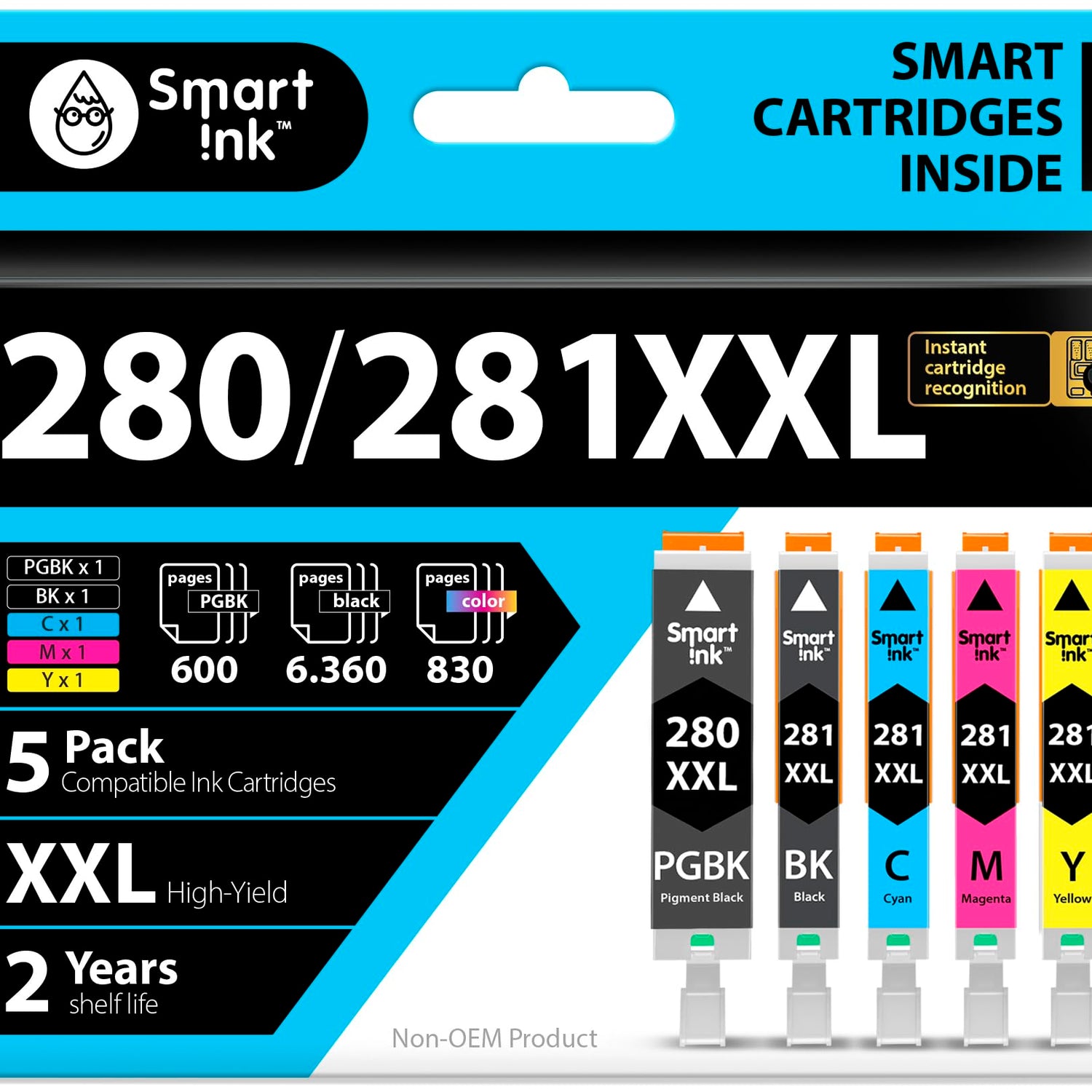 Smart Ink Compatible Ink Cartridges Replacement for Canon 281 280 PGI-280XXL CLI-281XXL (5 Combo Pack) to use with Canon Printers Pixma TR8520 TS9120 TS6120 TR8620 TR8620a TS6320 TR7520 PGBK/BK/C/M/Y
