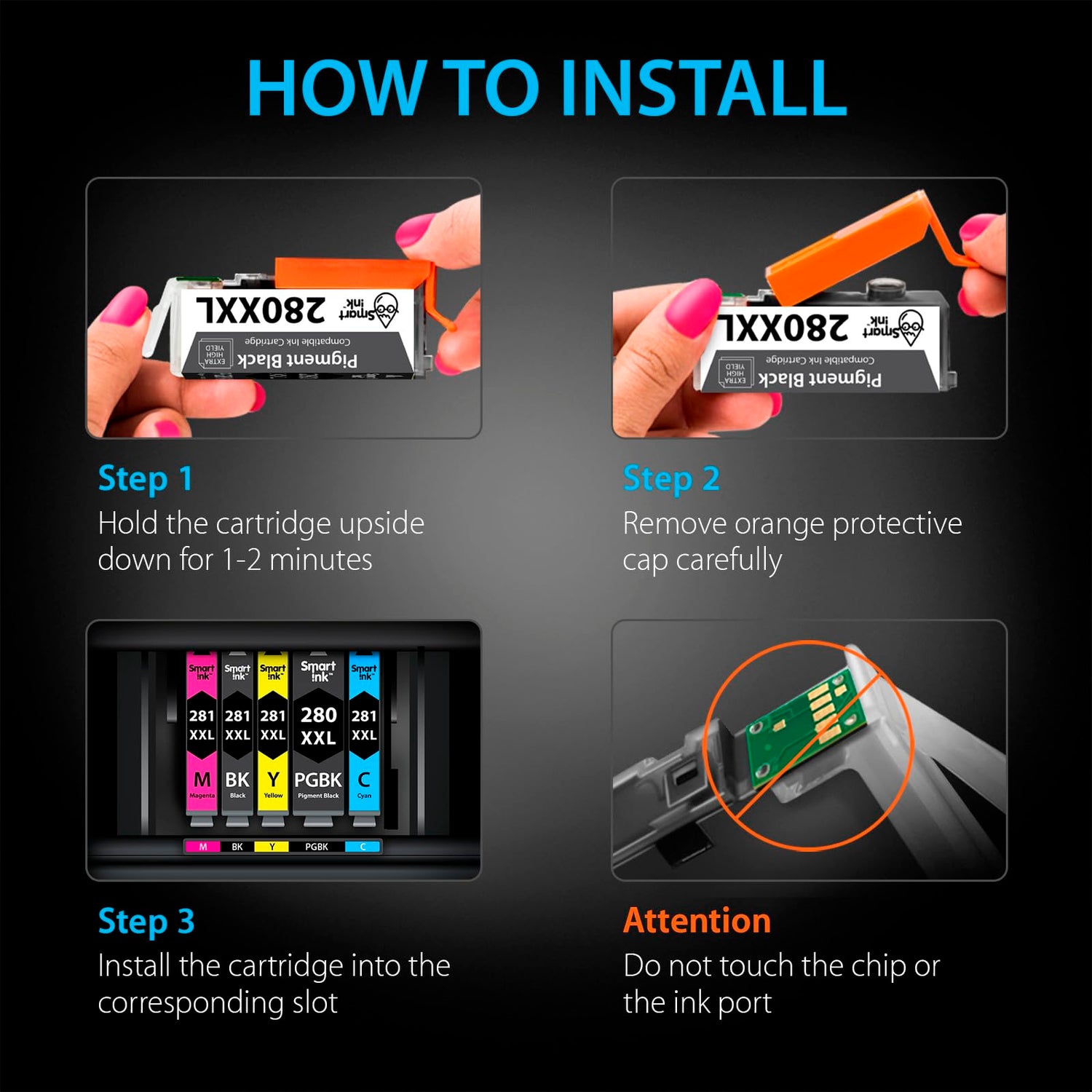 - Package Contents: 1 x Pigment Black 280 XXL, 1 x Black 281 XXL, 1 x Cyan 281 XXL, 1 x Magenta 281 XXL, 1 x Yellow 281 XXL (5 cartridges in total)